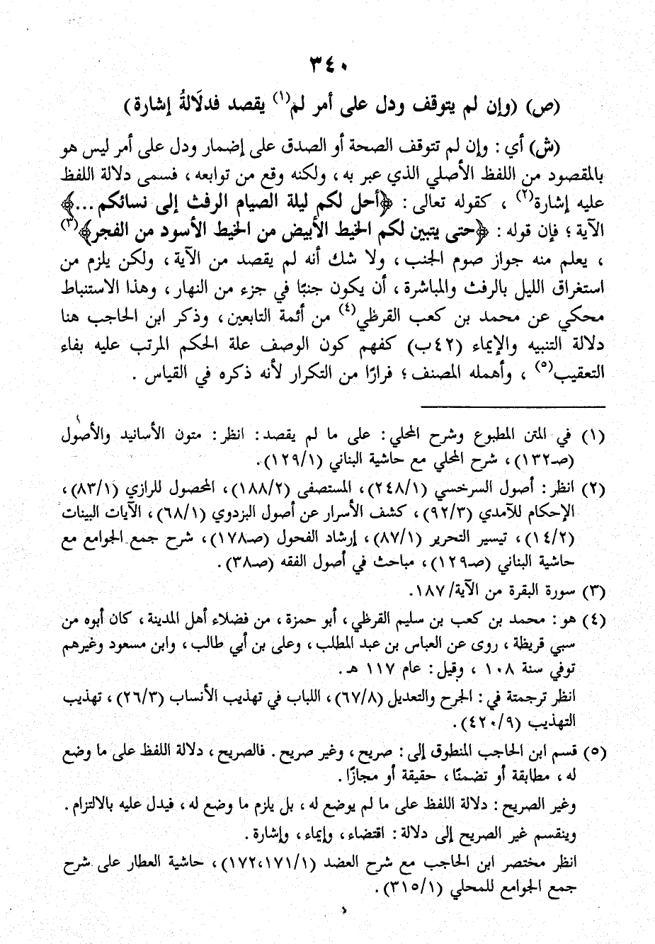 ش: أي: وإن لم تتوقف الصحة أو الصدق على إضمار ودل على أمر ليس هو بالمقصود من اللفظ الأصلي الذي عبر به، ولكنه وقع من توابعه، فسمى دلالة اللفظ عليه إشارة، كقوله تعالى: {أحل لكم ليلة الصيام الرفث إلى نسائكم ..} الآية، فإنَّ قوله: {حتى يتبين لكم الخيط الأبيض من الخيط الأسود من الفجر}، يعلم منه جواز صوم الجنب، ولا شك أنه لم يقصد من الآية، ولكن يلزم من استغراق الليل بالرفث والمباشرة، أن يكون جنباً في جزء من النهار، وهذا الاستنباط محكي عن مُحَمَّد بن كَعْب القرظي من أئمة التابعين، وذكر ابن الحاجب هنا دلالة التنبيه والإيماء (٤٢ ب) كفهم كون الوصف علة الحكم المرتب عليه بفاء التعقيب وأهمله المصنف، فراراً من التكرار لأنَّه ذكره في القياس.