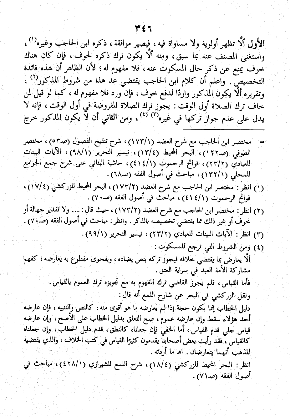الأول ألا تظهر أولوية ولا مساواة فيه، فيصير موافقة، ذكره ابن الحاجب وغيره، واستغنى المصنف عنه بما سبق، ومنه ألا يكون ترك ذكره لخوف، فإنَّ كانَ هناك خوف يمنع عن ذكر حال المسكوت عنه، فلا مفهوم له؛ لأنَّ الظاهر أن هذه فائدة التخصيص، واعلم أن كلام ابن الحاجب يقتضي عد هذا من شروط المذكور، وتقريره ألا يكون المذكور وأرداً لدفع خوف، فإنَّ ورد فلا مفهوم له، كما لو قيل لمن خاف ترك الصلاة أول الوقت: يَجُوز ترك الصلاة المفروضة في أول الوقت، فإنَّه لا يدل على عدم جواز تركها في غيره، ومن الثاني أن لا يكون المذكور خرج