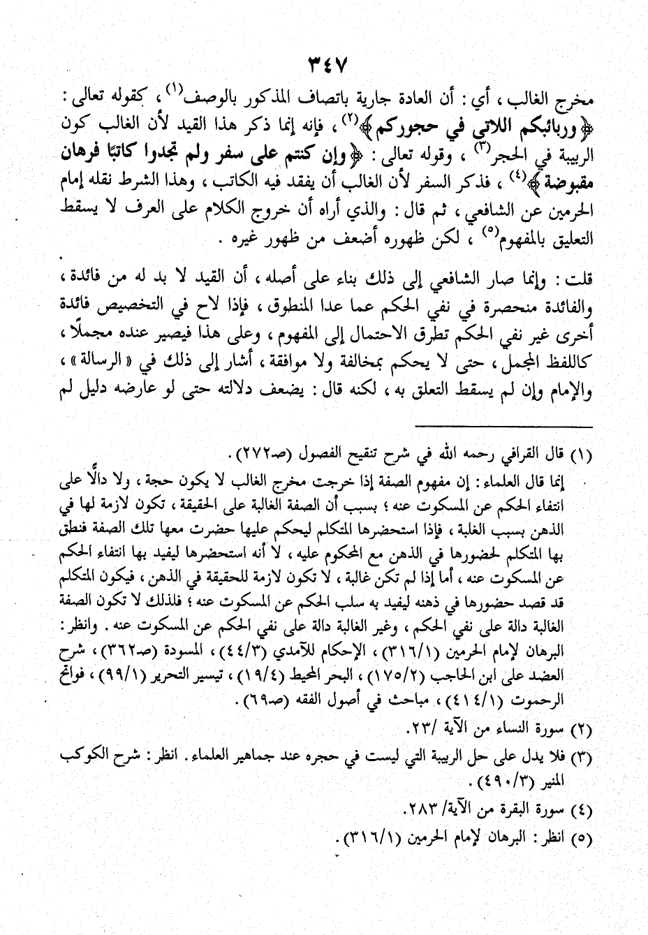 مخرج الغالب، أي: أن العادة جارية باتصاف المذكور بالوصف، كقوله تعالى {وربائبكم اللاتي في حجوركم} فإنَّه إنما ذكر هذا القيد لأنَّ الغالب كون الربيبة في الحجر، وقوله تعالى: {وإن كنتم على سفر ولم تجدوا كاتباً فرهان مقبوضة} فذكر السفر لأنَّ الغالب أن يفقد فيه الكاتب، وهذا الشرط نقله إمام الحرمين عن الشافعي، ثمَّ قالَ: والذي أراه أن خروج الكلام على العرف لا يسقط التعليق بالمفهوم، لكن ظهوره أضعف من ظهوره غيره.
