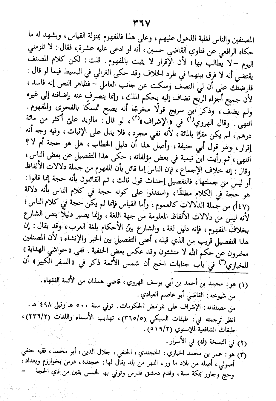 ثم رأيت ابن تَيْمِيَّةَ في بعض مؤلفاته، حكى هذا التفصيل عن بعض الناس، وقالَ: إنه خلاف الإجماع، فإنَّ الناس إما قائل بأن المفهوم من جملة دلالات الألفاظ أو ليس من جملتها، فالتفصيل إحداث قول ثالث، ثمَّ القائلون بأنه حجة إنما قالُوا: هو حجة في الكلام مطلقاً، واستدلوا على كونه حجة في كلام الناس بأنه دلالة (٤٧ أ) من جملة الدلالات كالعموم، وأما القياس فإنما لم يكن حجة في كلام الناس؛ لأنَّه ليس من دلالات الألفاظ المعلومة من جهة اللغة، وإنما يصير دليلاً بنص الشارع بخلاف المفهوم، فإنَّه دليل لغة والشارع بينَ الأحكام بلغة العرب، وقد يقال: إن هذا التفصيل قريب من الذي قبله، أعني التفصيل بينَ الخبر والإنشاء؛ لأنَّ المصنفين مخبرون عن حكم الله لا منشئون وقد عكس بعض الحنفية، ففي (حواشي الهداية) للخبازي في باب جنايات الحج أن شمس الأَئِمَّة ذكر في (السفر الكبير) أن