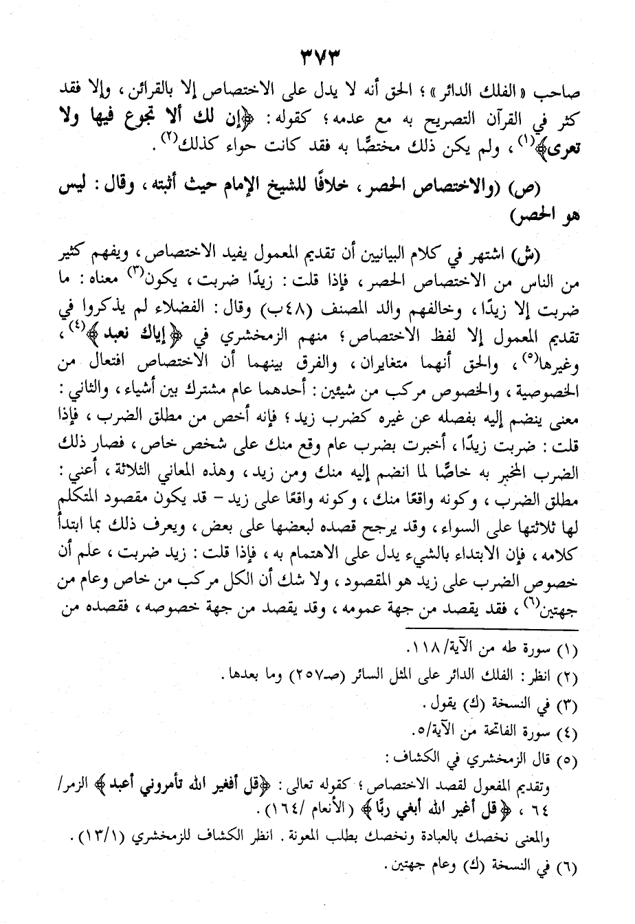 ش: اشْتَهَرَ في كلامِ البَيَانِيِّينَ أنَّ تقديمَ المعْمولِ يُفِيدُ الاخْتصاصَ، ويَفْهَمُ كثيرٌ من الناسِ من الاخْتصاصِ الحَصْرَ، فإذا قُلْتَ: زَيداً ضَرَبْتُ، يكونُ معناهُ: مَا ضَرَبْتُ إلاَّ زَيداًَ.