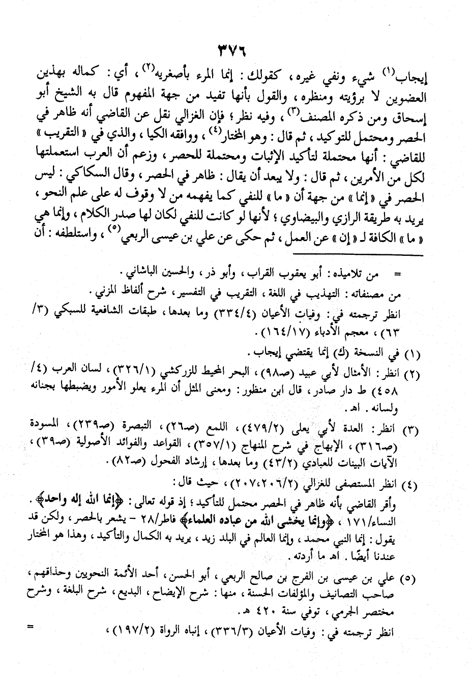 إِيجَابُ شيءٍ ونَفْيُ غيرِه، كقولِك: إنَّما المَرْءُ بأَصْغَرَيْهِ؛ أي: كَمَالُه بِهَذَيْنِ العُضُوَيْنِ لا بِرُؤيَتِه ومَنْظَرِه، والقولُ بأنَّها تُفِيدُ من جِهَةِ المفهومِ. قالَ به الشيخُ أَبُو إِسْحَاقَ ومَن ذَكَرَهُ المُصَنِّفُ، وفيه نَظَرٌ، فإنَّ الغَزَالِيَّ نَقَلَ عن القَاضِي أنَّه ظَاهِرٌ في الحَصْرِ ومُحْتَمِلٌ للتَّوْكيدِ، ثمَّ قالَ: وهو المختارُ، ووافَقَهُ الكِيَا، والذي في (التَّقْرِيبِ) للقَاضِي: أنَّها مُحْتَمِلَةٌ لتَاكِيدِ الإثْباتِ ومُحْتَمِلَةٌ للحَصْرِ، وزَعَمَ أنَّ العَرَبَ اسْتَعْمَلَتْها لكلٍّ مِن الأَمْرَيْنِ، ثمَّ قالَ: ولا يَبْعُدُ أنْ يُقالَ: ظاهرٌ في الحَصْرِ، وقالَ السَّكَاكِيُّ: ليسَ الحَصْرُ في (إنَّما) من جِهَةِ أنَّ (مَا) للنَّفِيِّ كما يَفْهَمَهُ مَن لا وُقُوفَ له على عِلْمِ النَّحْوِ، يُريدُ به طَريقَةَ الرَّازِيِّ والبَيْضَاوِيِّ؛ لأنَّها لو كانَتْ للنَّفْيِ لكانَ لها صَدْرُ الكلامِ، وإنَّما هي (مَا) الكَافَّةُ لـ (إِنَّ) عن العَمَلِ.