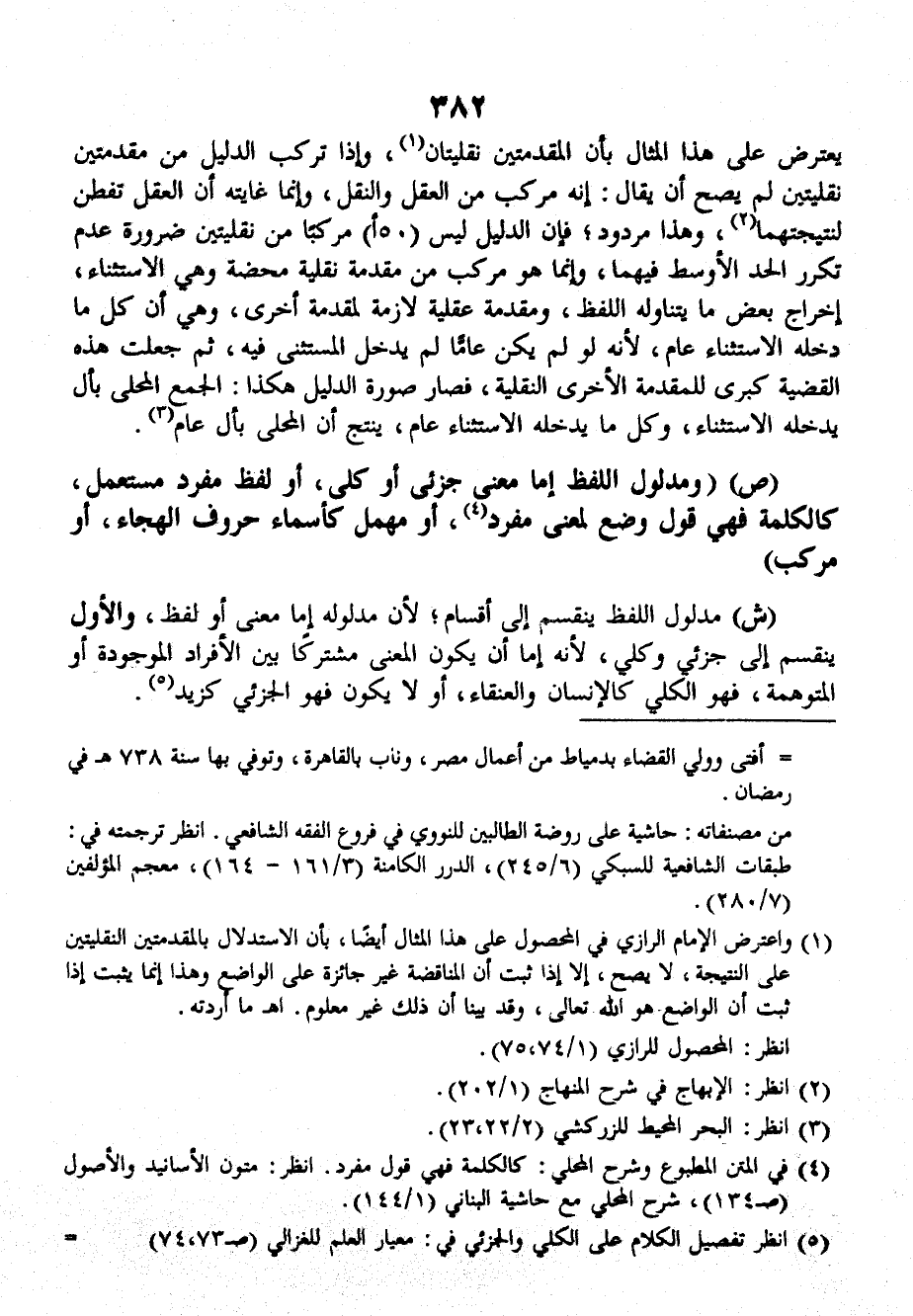 يَعْتَرِضُ على هذا المثالِ بأنَّ المُقَدِّمَتَيْنِ نَقْلِيَّتَانِ، وإذا تَرَكَّبَ الدليلُ من مقدمتَيْنِ نَقْلِيَّتَيْنِ لم يَصِحَّ أنْ يُقالَ: إنَّه مُرَكَّبٌ من العَقْلِ والنَّقْلِ، وإنَّما غايتُه أنَّ العَقْلَ تَفَطَّنَ لنَتِيجَتِهِمَا، وهذا مردودٌ، فإنَّ الدليلَ ليسَ مُرَكَّباً من نَقْلِيَّتَيْنِ ضَرَورَةٌ عَدَمِ تَكَرُّرِ الحَدِّ الأوسْطِ فيهما، وإنَّما هو مُرَكَّبٌ من مُقَدِّمَةٍ نَقْلِيَّةٍ مَحْضَةٍ، وهي الاستثناءُ، إخْراجُ بعضِ ما يَتَنَاولُه اللفظُ، ومُقَدِّمَةٍ عَقْلِيَّةٍ لازمَةٍ لمُقَدِّمَةٍ أُخْرَى، وهي أنَّ كُلَّ ما دَخَلَه الاستثناءُ عامٌّ، لأنَّه لو لم يكنُ عاماً لم يَدْخُلِ المُسْتَثْنَى فيه، ثمَّ جُعِلَتْ هذه القضيةُ كُبْرَى للمُقَدِّمَةِ الأُخْرَى النَّقْلِيَّةِ، فصَارَ صُورَةُ الدليلِ هكذا: الجَمْعُ المُحَلَّى بألْ يَدْخُلُه الاستثناءُ، وكلُّ ما يَدْخُلُه الاستثناءُ عامٌّ، يَنْتُجُ أنَّ المُحَلَّى بألْ عَامٌّ.