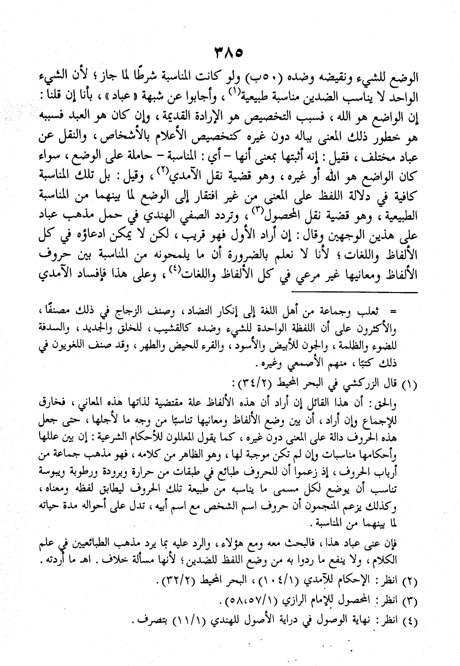وتَرَدَّدَ الصَّفِيُّ الهِنْدِيُّ في حَمْلِ مَذْهَبِ عَبَّادٍ على هَذَيْنِ الوَجْهَيْنِ، وقَالَ: إنْ أَرَادَ الأوَّلُ فهو قَرِيبٌ، لكنْ لا يُمْكِنُ ادَّعَاؤهُ في كلِّ الألفاظِ واللُّغاتِ، لأنَّا لا نَعْلَمُ بالضَّرُورَةِ أنَّ ما يَلْمَحُونَه من المناسبةِ بينَ حُروفِ الألفاظِ ومَعانِيها غيرَ مَرْعِيٍّ في كلِّ الألفاظِ واللُّغَاتِ، وعلى هذا فإفْسادُ الآمِدِيِّ