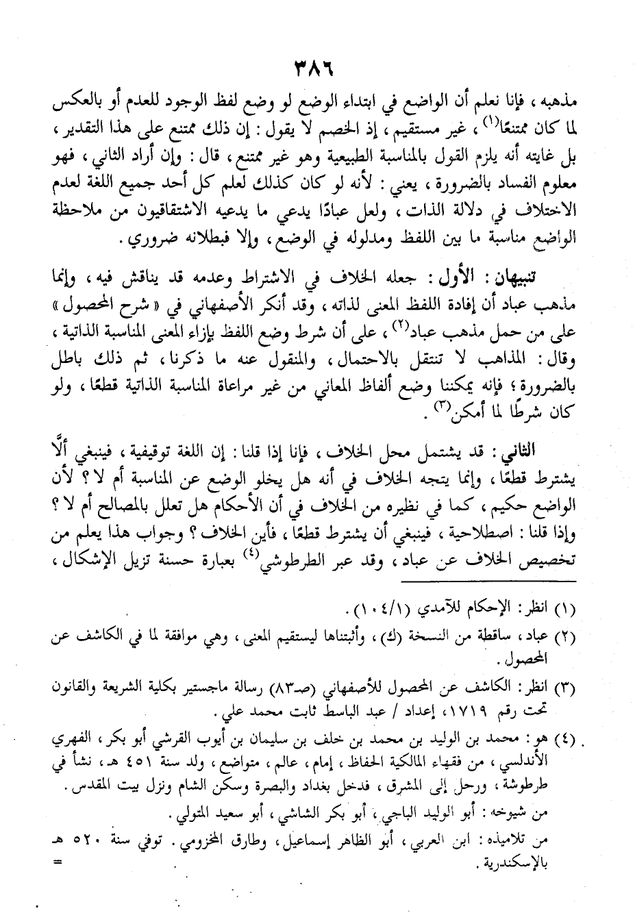 تنبيهانِ: الأوَّلُ: جَعْلُه الخلافَ في الاشْتِراطِ وعَدَمِه قد يُنَاقِشُ فيه، وإنَّما مَذْهَبُ عَبَّادٍ أنَّ إفادَةَ اللفظُ المعنَى لذاتِه، وقد أَنْكَرَ الأصْفَهَانِيُّ في (شَرْحِ المَحْصُولِ) على مَن حَمَلَ مَذْهَبَ عَبَّادٍ على أنَّ شَرْطَ وَضْعِ اللفظِ بإزاءِ المعنَى المُنَاسَبَةُ الذَّاتِيَّةُ.