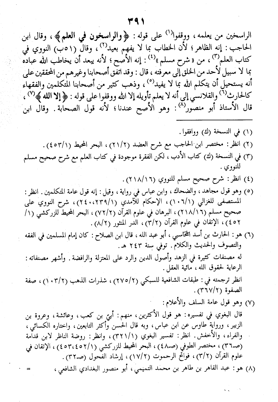 الرَّاسِخِينَ مَن يَعْلَمُه، ووَقَفُوا على قولِه: {وَالرَّاسِخُونَ فِي الْعِلْمِ}. وقالَ ابنُ الحَاجِبِ: إنَّه الظاهرُ؛ لأنَّ الخِطَابَ بما لا يُفْهَمُ بعيدٌ، وقالَ النَّوَوِيُّ في كتابِ العِلْمِ من (شَرْحِ مُسْلِمٍ)، إنَّه الأَصَحُّ؛ لأنَّه يَبْعُدُ أنْ يُخَاطِبَ اللهُ عِبادَه بما لا سبيلَ لأَحَدٍ من الخَلْقِ إلى مَعْرِفَتِه، قالَ: وقد اتَّفَقَ أصْحَابُنَا وغيرُهم من المُحَقِّقِينَ على أنَّه يَسْتَحِيلُ أنْ يَتَكَلَّمَ اللهُ بما لا يُفِيدُ.