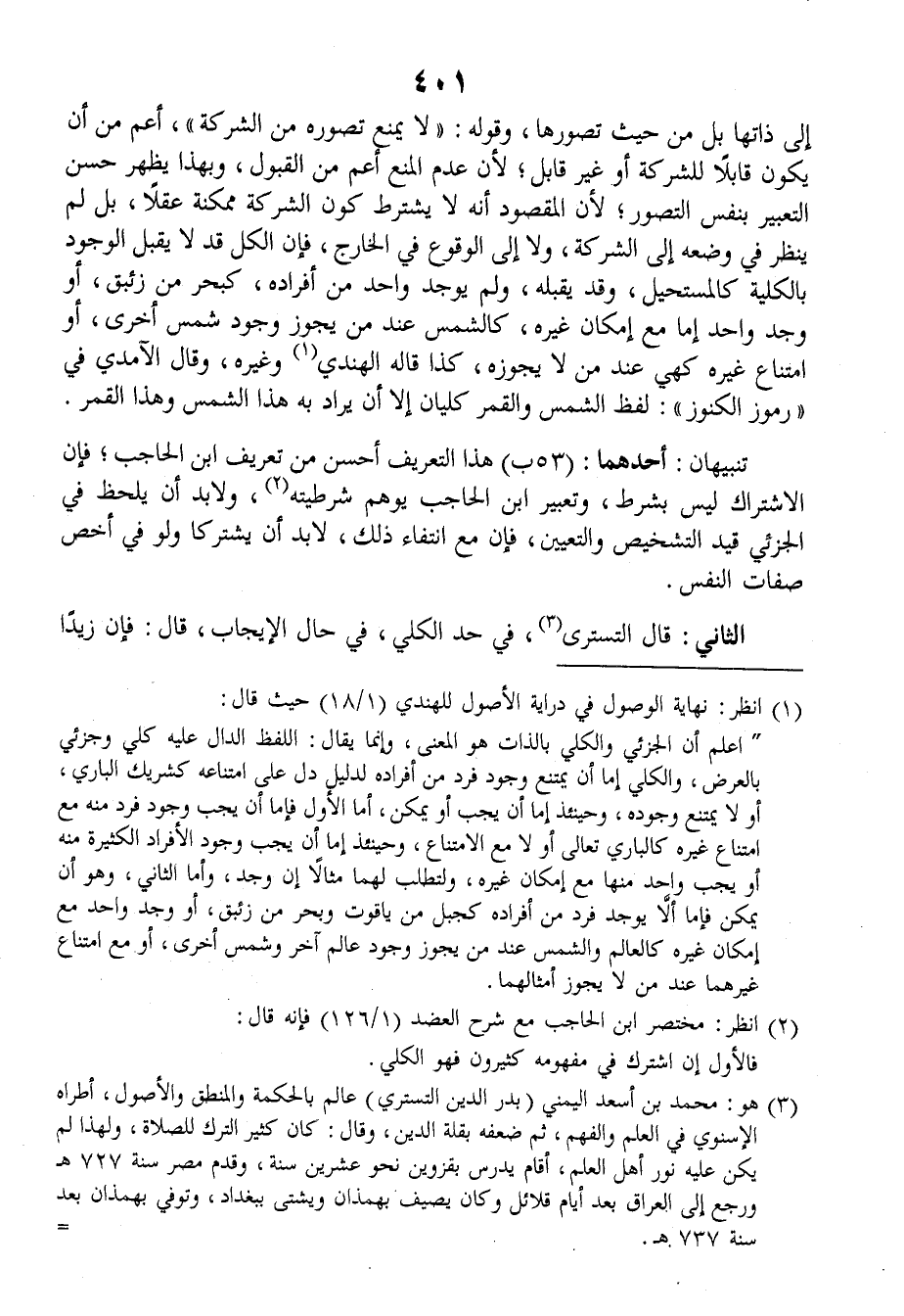 الثاني: قالَ التَّسْتَرِيُّ، في حَدِّ الكًُلِّيِّ، في حالِ الإيجابِ، قالَ: فإنَّ زيداً