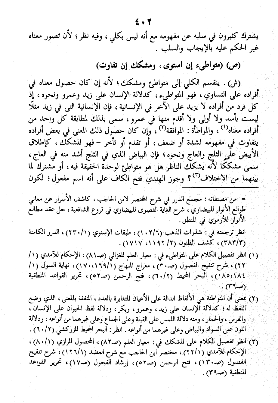 ش: يَنْقَسِمُ الكُلِّيُّ إلى مُتَوَاطِئٍ ومُشَكِّكٍ؛ لأنَّه إنْ كانَ حُصُولُ معناهُ في أفْرَادِه على التَّساوِي، فهو المُتَواطِئُ كدلالَةِ الإنسانِ على زَيدٍ وعمرٍو ونحوِه، إذِ كُلُّ فَرْدٍ من أَفْرَادِه لا يَزِيدُ على الآخَرِ في الإنسانِيَّةِ، فإنَّ الإنسانِيَّةَ التي في زَيدٍ مَثَلاً ليْسَتْ بِأَسَدٍ ولا أَوْلَى ولا أَقْدَمُ منها في عمرٍو، سُمِّيَ بذلك لمُطَابَقَةِ كلِّ واحدٍ من أفرادِه معناهُ، والمُوَاطَأَةُ: المُوَافَقَةُ، وإنْ كانَ حُصُولُ ذلك المعنَى في بعضِ أفْرَادِه يَتَفَاوتُ في مَفْهُومِه لشِدَّةٍ أو ضَعْفٍ، أو تَقَدُّمٍ أو تَأَخُّرٍ ـ فهو المُشَكِّكُ، كإطلاقِ الأبَيضِ على الثَّلْجِ والعَاجِّ ونحوِه، فإنَّ البَياضَ الذي في الثَّلْجِ أَشَدُّ منه في العَاجِّ، سُمِّيَ مُشَكِّكاً؛ لأنَّه يُشَكِّكُ النَّاظِرَ هل هو مُتَوَاطِئٌ لوحِدَةِ الحقيقَةِ فيه، أو مُشْتَرِكٌ لِمَا بينَهُما من الاختلافِ؟ وجَوَّزَ الهِنْدِيُّ فَتْحَ الكافِّ على أنَّه اسمُ مفعولٍ، لكونِ
