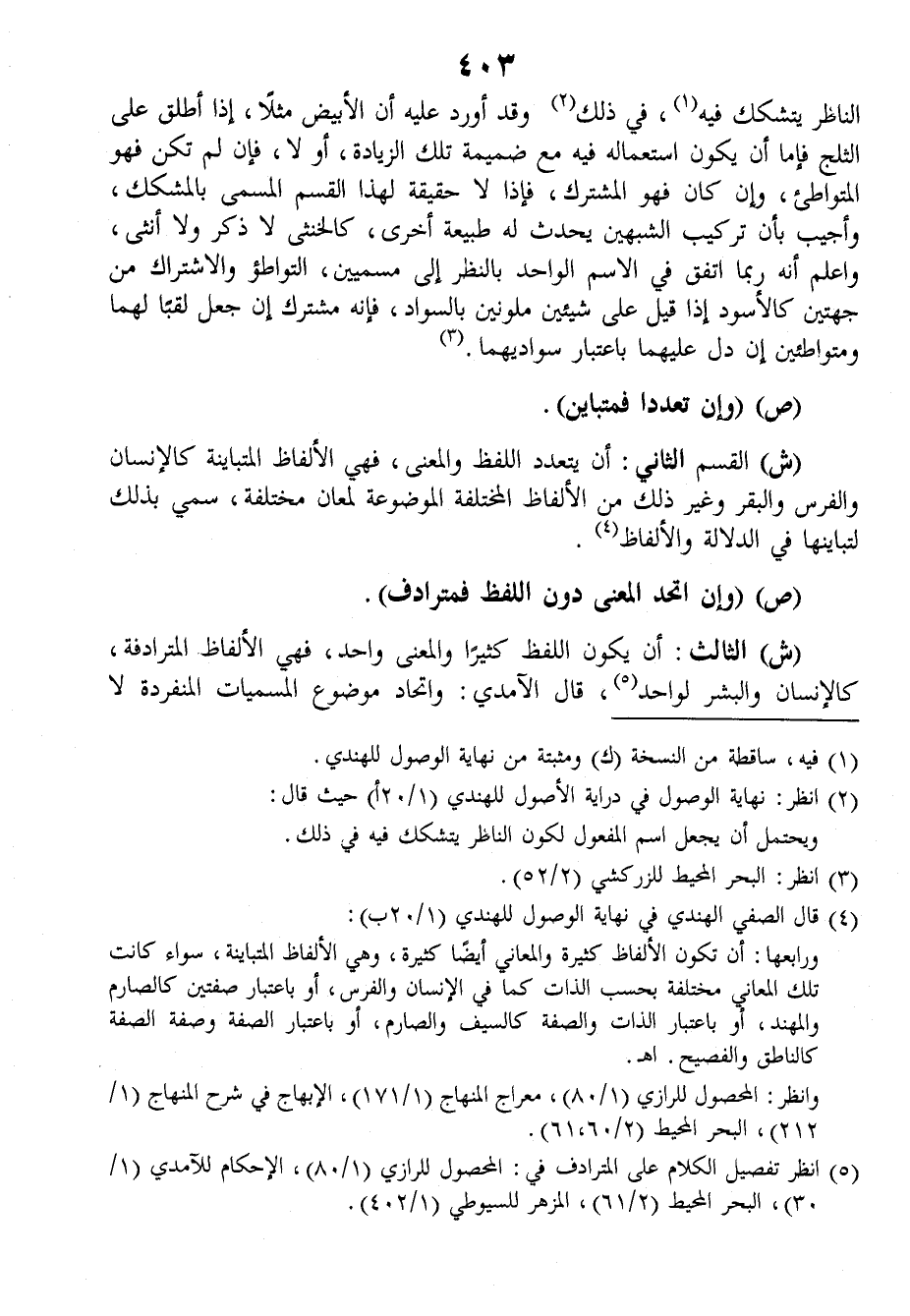ش: الثالثُ: أنْ يكونَ اللفظُ كثيراً والمعنَى واحدٌ، فهي الألفاظُ المترادفِةُ، كالإنسانِ والبَشَرِ لِواحدٍ، قالَ الآمِدِيُّ: واتِّحادُ موضوعِ المُسَمِّياتِ المُنْفِرِدَةِ لا