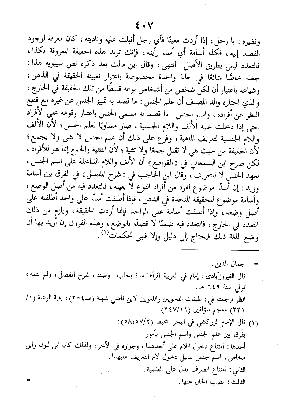 وقالَ ابنُ الحَاجِبِ في (شَرْحِ المُفَصَّلِ) في الفَرْقِ بينَ أُسَامَةَ وزَيدٍ: إنَّ أسداً مَوْضُوعٌ لفَرْدٍ من أفرادِ النَّوْعِ لا بعَيْنِه، فالتَّعَدُّدُ فيه من أَصْلِ الوَضْعِ، وأُسَامَةَ موضوعٌ للحقيقةِ المُتَّحِدَةِ في الذِّهْنِ، فإذا أَطْلَقْتَ أسداً على واحدٍ أَطْلَقْتَه على أَصْلِ وَضْعِه، وإذا أَطْلَقْتَ أُسَامَةَ على الواحدِ فإنَّما أَرَدْتَ الحقيقةَ، ويَلْزَمُ من ذلك التَّعَدُّدُ في الخارجِ، فالتَّعَدُّدُ فيه ضِمْناً لا قَصْداً بالوَضْعِ، وهذه الفروقُ إنْ أُرِيدَ بها أنَّ وَضْعَ اللُّغَةِ ذلك فيَحْتَاجُ إلى دليلٍ وإلاَّ فهِيَ تَحَكُّمَاتٍ.