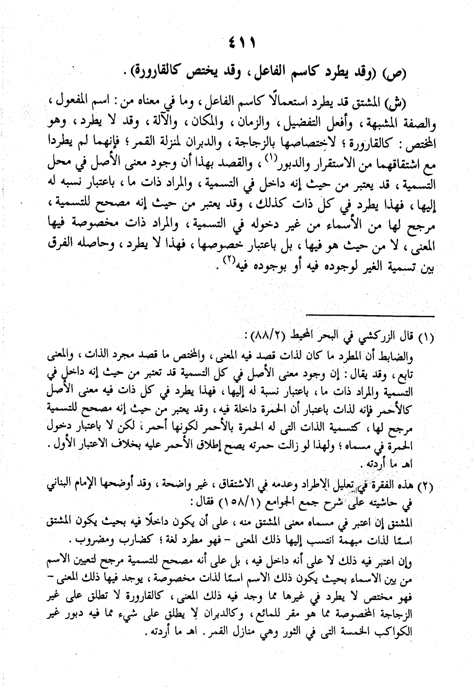ش: المُشْتَّقُ قد يُطَّرَدُ استعمالاً كاسمِ الفاعلِ، وما في معناهُ من: اسمِ المفعولِ، والصفةِ المُشَبَّهَةِ، وأفعلِ التفضيلِ، والزمانِ، والمكانِ، والآلةِ، وقد لا يُطَّرَدُ. وهو المختصُّ: كالقارورةِ، لاخْتصاصِها بالزُّجاجَةِ، والدَّبَرَانِ لمنزلَةِ القَمَرِ، فإنَّهما لم يَطَّرِدَا مع اشْتِقَاقِهِما من الاسْتِقْرارِ والدَّبُورِ، والقَصْدُ بهذا أنَّ وجودَ معنى الأصْلِ في مَحَلِّ التَّسْمِيَةِ قد يُعْتَبَرُ من حيثُ إنَّه داخلٌ في التَّسْمِيَةِ، والمرادُ ذاتُ ما، باعتبارِ نَسَبِه له إليها، فهذا يَطَّرِدُ في كلِّ ذاتٍ كذلك، وقد يُعْتَبَرُ من حيثُ إنَّه مُصَحِّحٌ للتَّسْمِيَةِ، مُرَجِّحٌ لها من الأسماءِ من غيرِ دُخولِه في التَّسْمِيَةِ، والمرادُ ذاتٌ مَخْصُوصَةٌ فيها المعنَى، لا من حيثُ هو فيها، بل باعتبارِ خصوصِها، فهذا لا يُطَّرَدُ، وحاصلُه الفَرْقِ بينَ تَسْمِيَةِ الغيرِ لوجودِه فيه أو بوجودِه فيه.
