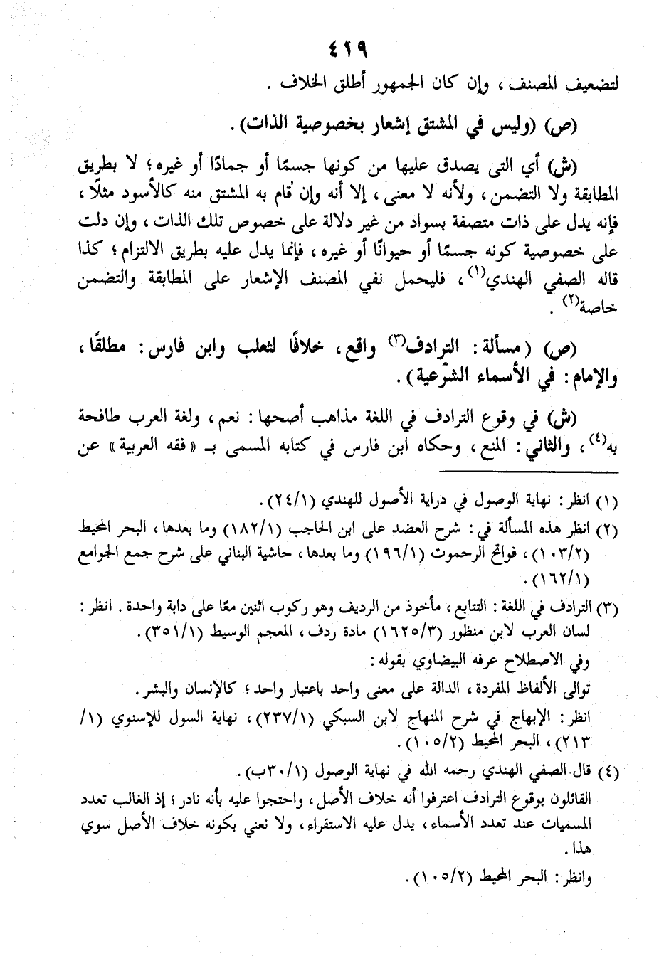 ش: في وقوعِ التَّرَادُفِ في اللُّغَةِ مذاهبُ، أَصَحُّهَا: نَعَمْ، ولُغَةُ العَرَبِ طَافِحَةٌ به.