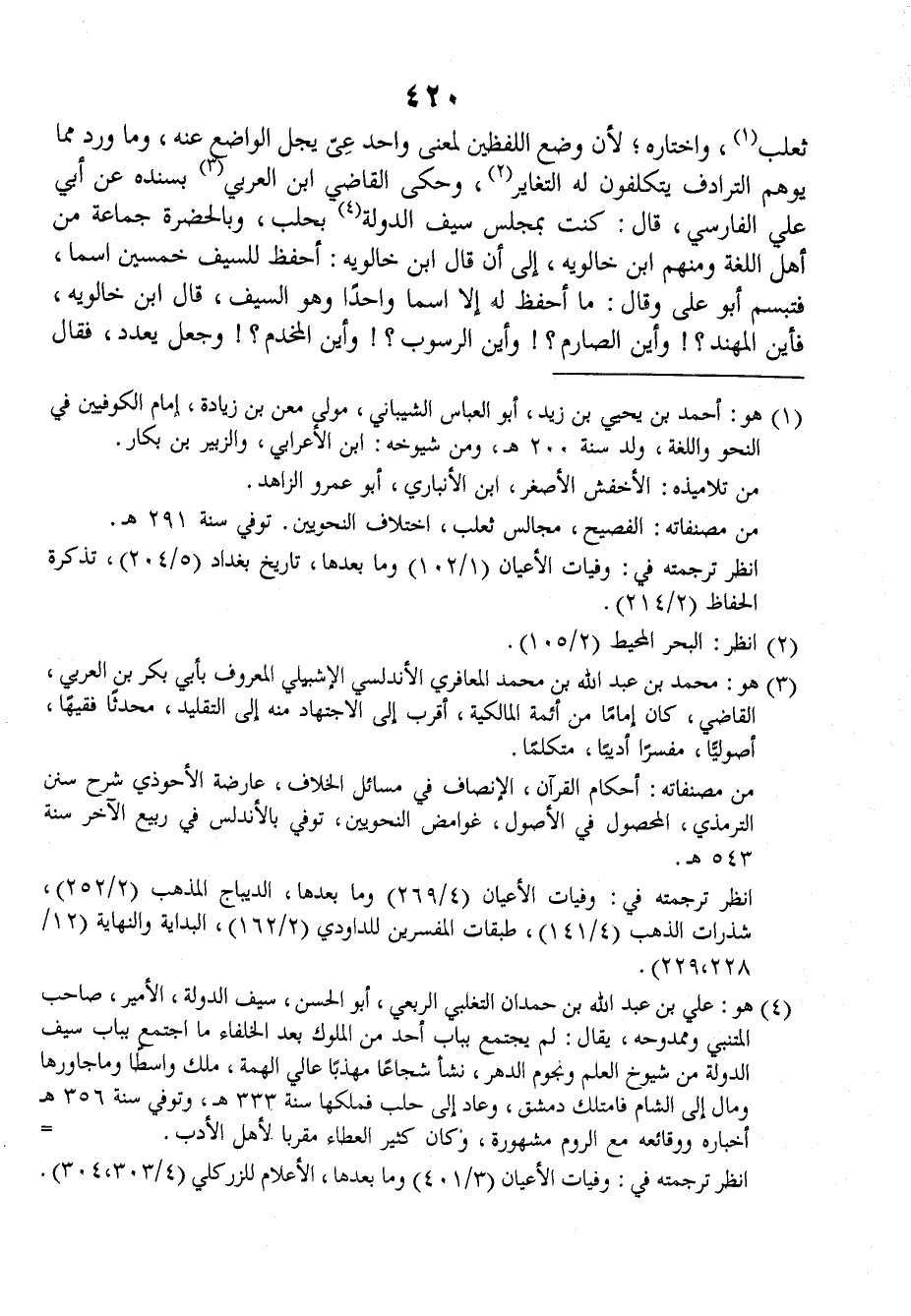 ثَعْلَبٍ، واختارَهُ؛ لأنَّ وَضْعَ اللفظَيْنِ لمعنًى واحدٍ عِيٍّ يَجِلُّ الواضِعَ عنه، وما وَرَدَ مِمَّا يُوهِمُ التَّرَادُفُ يَتَكَلَّفُونَ له التَّغَايُرَ.