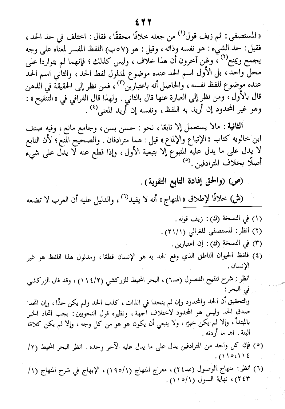 (المُسْتَصْفَى) ثمَّ زَيَّفَ قولُ مَن جَعَلَه خلافاً مُحَقَّقاً، فقالَ: اخْتُلِفَ في حَدِّ الحَدِّ، فقيلَ: حَدُّ الشيءِ: هو نَفْسُه وذاتُه، وقيلَ: هو اللفظُ المُفَسِّرُ لمعناهُ على وَجْهٍ يَجْمَعُ ويَمْنَعُ، وظَنَّ آخرونَ أنَّ هذا خلافٌ، وليسَ كذلكَ، فإنَّهما لَمَّا يَتَوَارَدَا على مَحَلٍّ واحدٍ، بل الأوَّلُ اسمُ الحدِّ عندَه موضوعٌ لمدلول لفظِ الحَدِّ، والثاني اسمُ الحدِّ عندَه موضوعٌ للفظِ نَفْسِه.