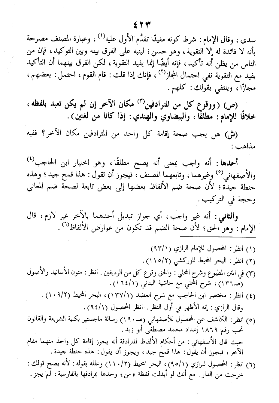 ش: هل يَجِبُ صِحَّةُ إقَامَةِ كلًَّ واحدٍ من المترادفَيْنِ مكانَ الآخَرِ؟ ففيه مذاهبَ: