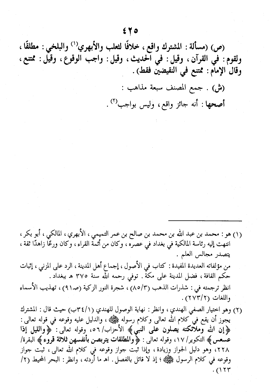 ص: (مسألَةٌ: المُشْتَرِكُ واقِعٌ، خلافاً لثَعْلَبٍ والأَبْهَرِيِّ والبَلْخِيِّ مُطْلَقاً، ولقومٍ: في القرآنِ، وقيلَ: في الحديثِ، وقيلَ: واجِبُ الوقوعِ، وقيلَ: مُمْتَنِعٌ، وقالَ الإمامُ: مُمْتَنِعٌ في النَّقِيضَيْنِ فقط).
