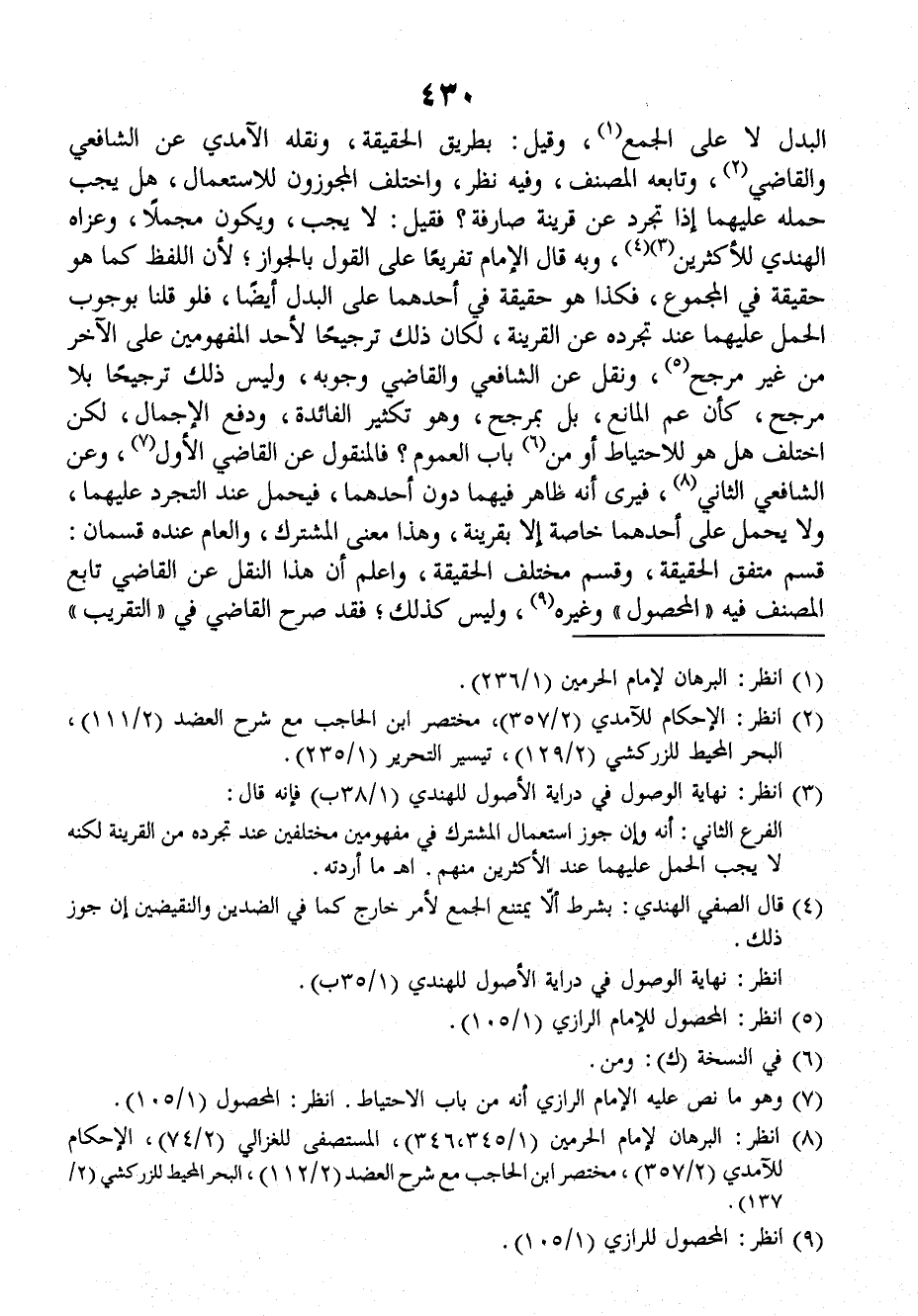البَدَلِ لا على الجَمْعِ، وقيلَ: بطَرِيقِ الحقيقةِ، ونَقَلَهُ الآمِدِيُّ عن الشافِعِيِّ والقَاضِيِّ، وتَابَعَه المُصَنِّفُ، وفيه نَظَرٌ، واخْتَلَفَ المُجَوِّزُونَ للاسْتِعْمَالِ، هل يَجِبُ حَمْلُه عليهما إذا تَجَرَّدَ عن قَرِينَةٍ صَارِفَةٍ؟ فقيلَ: لا يَجِبُ، ويكونُ مُجْمَلاً، وعَزَاهُ الهِنْدِيُّ للأكْثَرِينَ، وبه قالَ الإمامُ تَفْرِيعاً على القولِ بالجوازِ؛ لأنَّ اللفظَ كما هو حقيقةٌ في المجموعِ، فكذا هو حقيقةٌ في أحدِهما على البَدَلِ أيضاً، فلو قُلْنَا بوجوبِ الحَمْلِ عليهما عندَ تَجَرُّدِه عن القرينَةِ، لكانَ ذلك تَرْجِيحاً لأحدِ المَفْهُومَيْنِ على الآخَرِ من غيرِ مُرَجَّحٍ، ونُقِلَ عن الشافِعِيِّ والقَاضِي وجُوبُه، وليسَ ذلك تَرْجِيحاً بلا مُرَجَّحٍ، كأنْ عَمَّ المَانِعُ، بل بمُرَجَّحٍ، وهو تَكْثِيرُ الفائدَةِ، ودَفْعُ الإجْمَالِ، لكنِ اخْتَلَفَ هل هو للاحتياطِ أو من بابِ العُمُومِ؟ فالمَنْقُولُ عن القَاضِي الأَوَّلُ، وعن الشَّافِعِيِّ الثاني، فيَرَى أنَّه ظَاهِرٌ فيهما دونَ أَحَدِهما، فيُحْمَلُ عندَ التَّجَرُّدِ عليهما، ولا يُحْمَلُ على أحدِهما خاصَّةً إلاَّ بقَرِينَةٍ، وهذا معنى المُشْتَرَكِ، والعامُّ عندَه قِسْمَانِ: قِسْمٌ مُتَّفَقُ الحقيقةِ، وقِسْمٌ مُخْتَلِفُ الحقيقةِ، واعْلَمْ أنَّ هذا النَّقْلَ عن القَاضِي تَابَعَ المُصَنِّفُ فيه = (المحصولَ) وغيرَه، وليسَ كذلكَ فقد صَرَّحَ القاضِي في (التقريبِ)