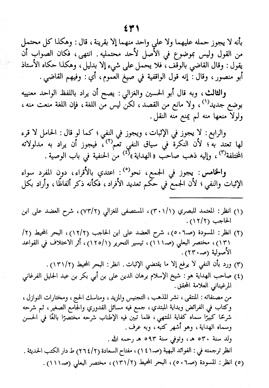 والرابِعُ: لا يَجُوزُ في الإثباتِ، ويَجُوزُ في النَّفْيِ، كما لو قالَ: الحَامِلُ لا قَرْءَ لها تَعْتَدُّ به؛ لأنَّ النَّكِرَةَ في سياقِ النَّفْيِ تَعَمُّ، فيَجُوزُ أنْ يُرَادَ به مَدْلُولاتُه المُخْتَلِفَةُ، وإليه ذَهَبَ صاحبُ (الهِدَايَةِ) من الحَنَفِيَّةِ في بابِ الوَصِيَّةِ.