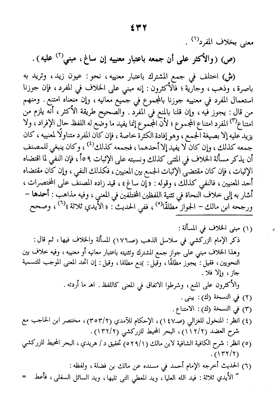 ش: اخْتُلِفَ في جَمْعِ المُشْتَرَكِ باعتبارِ مَعْنَيَيْهِ، نحوَ: عُيُونُ زَيدٍ، وتُرِيدُ به بَاصِرَةً، وذَهَب= وجاريَةً، فالأكْثَرُونَ: إنَّه مَبْنِيٌّ على الخلافِ في المُفْرَدِ، فإنْ جَوَّزْنَا اسْتِعْمَالَ المُفْرَدِ في مَعْنَيَيْهِ جَوَّزْنَا بالمجموعِ في جميعِ مَعَانِيهِ، وإنْ مَنَعْنَاهُ امْتَنَعَ، ومنهُم مَن قالَ: يَجُوزُ فيه، وإنْ قُلْنَا بالمَنْعِ في المُفْرَدِ، والصحيحُ طريقةُ الأكْثَرِ أنَّه يَلْزَمُ من امْتِنَاعِ المُفْرَدِ امْتَناعُ المجموعِ؛ لأنَّ المجموعَ إنَّما يُفِيدُ ما وُضِعَ له اللفظُ حالَ الإفرادِ، ولا يَزِيدُ عليه إلاَّ بِصِيغَةِ الجَمْعِ، وهو إفادَةُ الكَثْرَةِ خاصَّةً، فإنْ كانَ المُفْرَدُ مُتَنَاوِلاً لمَعْنَيَيْه، كانَ جَمْعُه كذلك، وإنْ كانَ لا يُفِيدُ إلاَّ أحدَهما، فجَمْعُه كذلك، وكانَ يَنْبَغِي للمُصَنِّفِ أنْ يَذْكُرَ مسألَةَ الخلافِ في المُثَنَّى كذلك، ونِسْبَتُه على الإثباتِ، فإنَّ النَّفْيَ لَمَّا اقْتَضَاهُ الإثْباتُ، فإنْ كانَ مُقْتَضَى الإثباتِ الجَمْعُ بينَ المَعْنَيَيْنِ، فكذلك النَّفْيُ، وإنْ كانَ مُقْتَضَاهُ أَحُدُ المَعْنَيَيْنِ، فالنَّفْيُ كذلك.