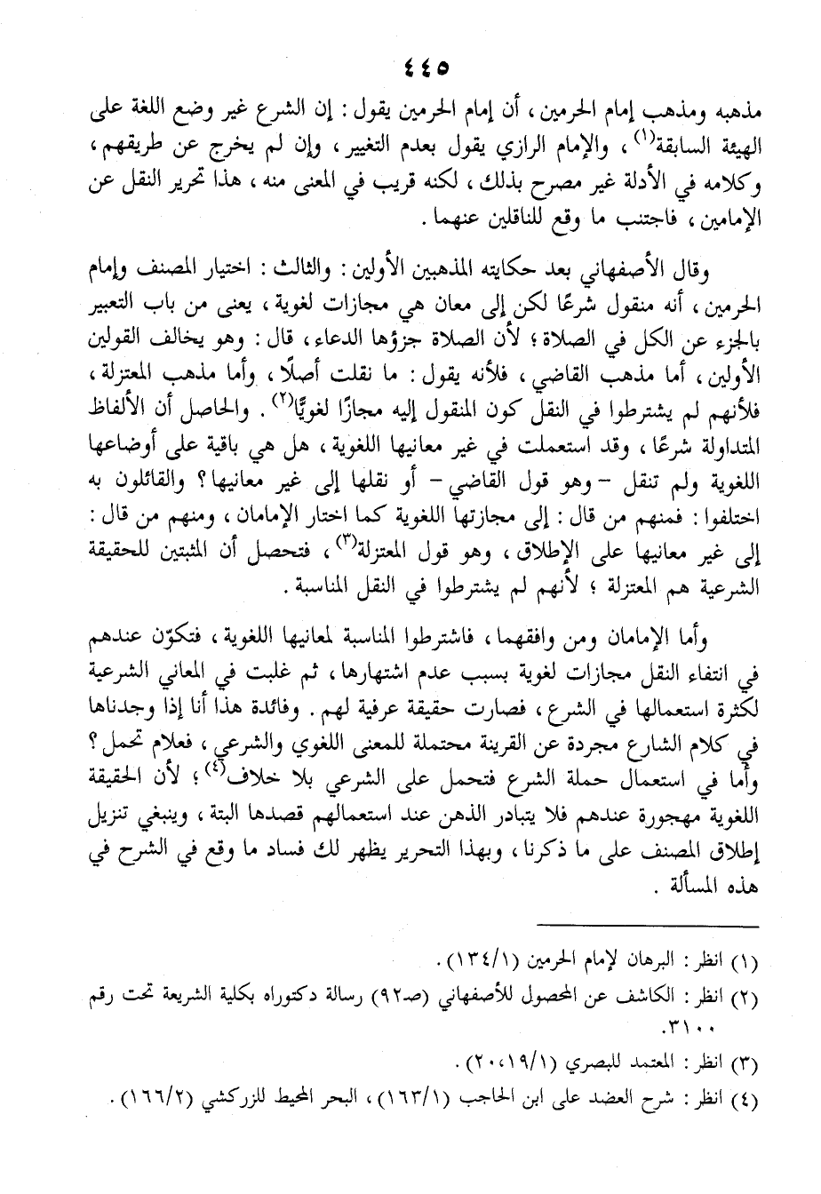 مَذْهَبِه ومَذْهَبِ إمامُ الحرمَيْنِ، أنَّ إمامَ الحرمَيْنِ يقولُ: إنَّ الشَّرْعَ غيرُ وَضْعِ اللغةِ على الهَيْئَةِ السَّابِقَةِ، والإمامُ الرَّازِيُّ يقولُ بعَدَمِ التَّغْييرِ، وإنْ لم يَخْرُجْ عن طَرِيقِهم، وكلامُه في الأدلَّةِ غيرُ مُصَرَّحٍ بذلك، لكنَّه قريبٌ في المعنَى منه، هذا تحريرُ النَّقْلِ عن الإمامَيْنِ، فاجْتَنِبْ ما وَقَعَ للنَّاقِلِينَ عنهما.