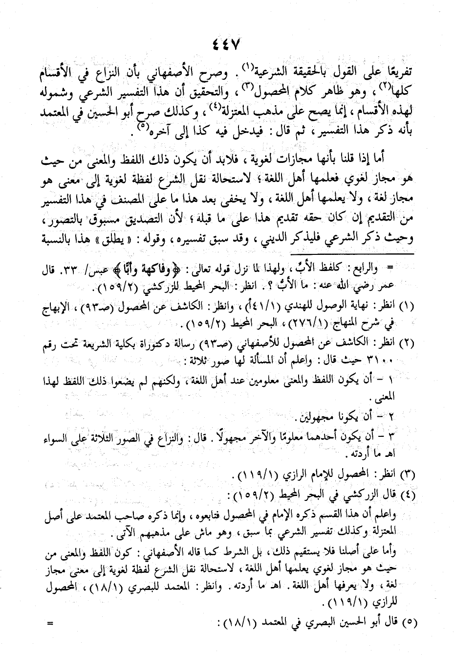 تَفْرِيعاً على القولِ بالحقَيقَةِ الشرعيَّةِ، وصَرَّحَ الأَصْفَهَانِيُّ بأنَّ النِّزَاعَ في الأقْسَامِ كُلِّها، وهو ظاهرٌ كلامُ (المحصولِ)، والتحقيقُ أنَّ هذا التفسيرَ الشرعيِّ وشمولَه لهذه الأقسامِ، إنَّما يَصِحُّ على مذهبِ المُعْتَزِلَةِ، وكذلك صَرَّحَ أَبُو الحُسَيْنِ في (المُعْتَمَدِ) بأنَّه ذَكَرَ هذا التفسيرُ، ثم قالَ: فيَدْخُلُ فيه كذا إلى آخَرِه.