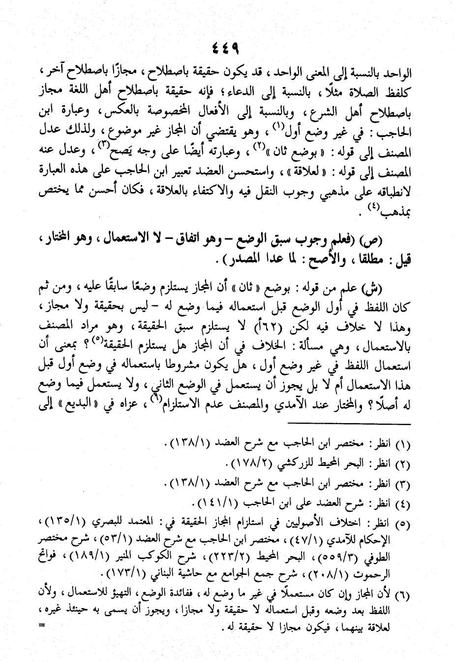الوَاحدُ بِالنِّسبَةِ إلى المَعنَى الوَاحِدِ، قَدْ يكونُ حقيقةً باصطِلاحٍ، مَجَازاً باصطِلاحٍ آخَرَ، كَلفظِ الصلاةِ مَثلاً، بِالنسبةِ إلى الدُّعاءِ، فِإنَّه حَقيقةً بِاصطِلاحِ أهلِ اللغةِ، مَجازاً باصطِلاحِ أهلِ الشَّرعِ، وبِالنسبةِ إلى الأفْعَالِ المَخصُوصةِ بِالعَكسِ، وَعِبَارَةُ ابنِ الحَاجِبِ: في غيرِ وضعٍ أوَّلٍ، وهُوَ يَقتضي أنَّ المَجَازَ غَيرُ مَوضوعٍ، ولذلكَ عَدَلَ المُصَنِّفُ إلى قَولِهِ: (بِوَضِعٍ ثَانٍ) وَعِبَارَتُه أيضاًً على وَجهٍ يَصِحُّ، وعَدَلَ عَنه المُصَنِّفُ إلى قولِه: (لِعَلاقَةٍ) واسْتَحسَنَ العَضَدُ تَعبيرَ ابنِ الحَاجِبِ على هذه العِبارَةِ لانْطِبَاقَهِ على مَذهَبَي وجوبِ النَّقلِ فيه والاكتِفَاءِ بِالعَلاقَةِ، فكانَ أحْسَنَ مِمَّا يَختَصُّ بِمَذهَبٍ.