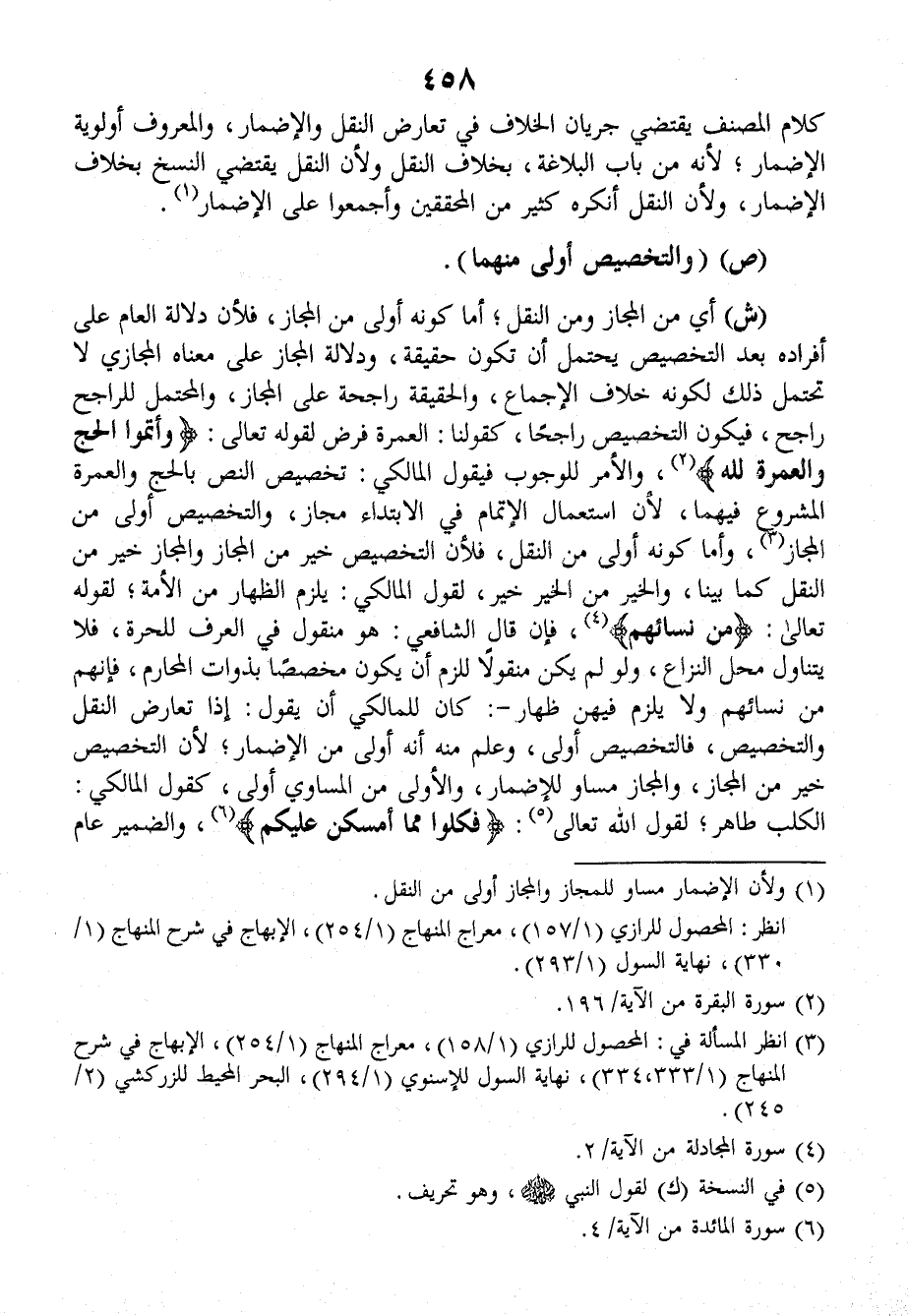 ش: أي: من المجازِ ومن النقلِ، أمَّا كونُه أوْلَى من المجازِ، فلأنَّ دلالةَ العامِّ على أفْرادِهِ بعدَ التخصيصِ يَحْتَمِلُ أنْ تكونَ حقيقةٌ، ودلالةُ المجازِ على مَعْناهُ المجازيِّ لا تَحْتَمِلُ ذلك لكونِه خلافَ الإجماعِ، والحقيقةُ راجِحَةٌ على المجازِ، والمُحْتَمَلُ للراجِحِ راجِحٌ، فيكونُ التخصيصُ راجحاً، كقولِنَا: العمرةُ فَرْضٌ لقولِه تعالَى: {وَأَتَمِّوُا الْحَجَّ وَالْعُمْرَةَ للهِ}، والأمرُ للوجوبِ فيقولُ المالكيُّ: تخصيصُ النصِّ بالحجِّ والعمرَةِ المشروعِ فيهما؛ لأنَّ استعمالَ الإتمامِ في الابتداءِ مجازٌ، والتخصيصُ أوْلَى من المجازِ، وأمَّا كونُه أوْلَى من النقلِ، فلأنَّ التخصيصَ خيرٌ من المجازِ والمجازُ خيرٌ من النقلِ كما بَيَّنَّا، والخيرُ من الخيرِ خيرٌ، لقولِ المالكيِّ: يَلْزَمُ الظِهارُ من الأمَةِ، لقولِه تعالى: {مِنْ نِسَائِهِمْ} فإنْ قالَ الشافعيُّ: هو منقولٌ في العُرْفِ للحرَّةِ، فلا يَتَناولُ مَحَلَّ النزاعِ، ولو لم يكنْ منقولاً لَلَزِمَ أنْ يكونَ مُخَصَّصاً بذواتِ المحارمِ، فإنَّهم من نِسائِهم ولا يَلْزَمُ فيهنَّ ظهارٌ، كانَ للمالكيِّ أنْ يقولَ: إذا تَعَارَضَ النقلُ والتخصيصُ، فالتخصيصُ أوْلَى، وعُلِمَ منه أنَّه أوْلَى من الإضْمارِ؛ لأنَّ التخصيصَ خيرٌ من المجازِ، والمجازُ مساوٍ= للإضمارِ، والأوْلَى، من المساوِي أوْلَى، كقولِ المالكيِّ: الكلبُ طَاهِرٌ، لقولِ اللهِ تعالَى: {فَكُلُوا مِمَّا أَمْسَكْنَ عَلَيْكُمْ}. والضميرُ عامٌّ