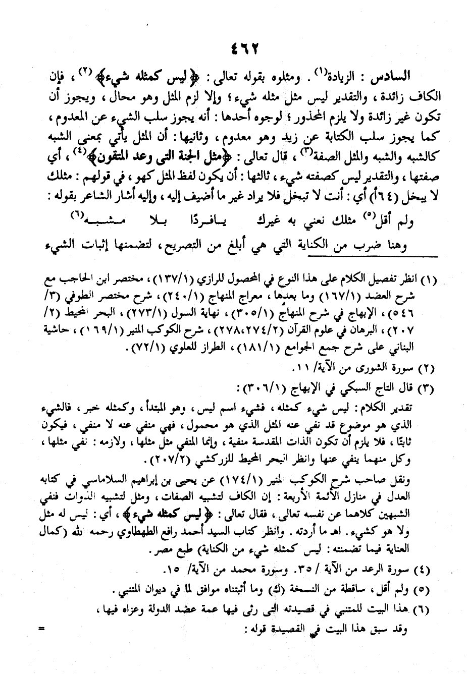وثانيها: أنَّ المثْلَ يَاتِي بمعنَى الشَّبَهِ كالشبهِ، والشبَهُ والمِثْلُ: الصفةُ، قالَ تعالَى: {مَثَلُ الْجَنَّةِ الَّتِي وُعِدَ الْمُتَّقُونَ}؛ أي: صِفَتُها، والتقديرُ ليسَ كصِفَتِه شيءٌ.