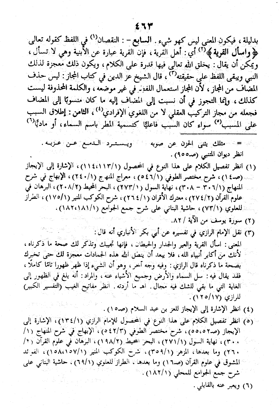 السابعُ: النقصانُ في اللفظِ، كقولِه تعالَى: {وَاسْأَلِ الْقَرْيَةَ}؛ أي: أهْلَ القريةِ، فإنَّ القريةَ عبارةٌ عن الأبْنِيَةِ وهي لا تُسْأَلُ، ويُمْكِنُ أنْ يُقالَ: يَخْلُقُ اللهُ تعالى فيها قُدْرَةً على الكلامِ، ويكونُ ذلك مُعْجِزَةً لذلك النبيِّ، ويَبْقَى اللفظُ على حقيقتِهِ، قالَ الشيخُ عِزُّ الدِّينِ في كتابِ (المجازِ): ليسَ حَذْفُ المضافِ من المجازِ؛ لأنَّ المجازَ استعمالُ اللفظِ في غيرِ مَوْضِعِه، والكلمةُ المَحْذُوفَةُ ليسَتْ كذلك، وإنَّما التجوُّزُ في أنْ نُسِبَتْ إلى المُضافِ إليه ما كانَ مَنْسُوباً إلى المُضافِ فجَعَلَهُ من مَجازِ التَّرْكِيبِ العَقْلِي لا من اللُّغويِّ الإفراديِّ.