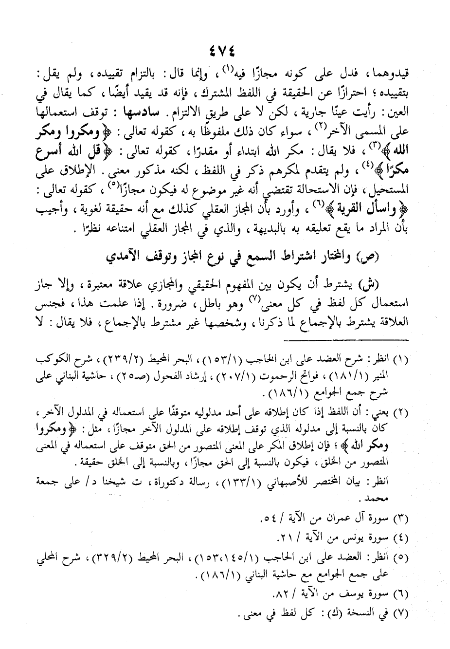 سادسُها: توقَّفَ اسْتِعْمَالُها على المُسْمَّى الآخَرِ، سواءٌ كانَ ذلك ملفوظاً به، كقولِه تعالى: {وَمَكَرُوا وَمَكَرَ اللهُ} فلا يُقالُ: مَكْرُ اللهِ ابتداءً أو مُقَدَّراً كقولِه تعالَى: {قُلِ اللهُ أَسْرَعُ مَكْراً}. ولم يَتَقَدَّمْ لمَكْرِهم ذِكْرٌ في اللفْظِ، لكنَّه مَذْكورٌ معنَى، الإطلاقُ على المُسْتَحيلِ، فإنَّ الاستحالةَ تَقْتَضِي أنَّه غَيرَ موضوعٍ له فيكونُ مجازاً، كقولِه تعالَى: {وَاسْأَلِ الْقَرْيَةِ} وأَورَدَ بأنَّ المجازَ العَقْلِيُّ كذلك معَ أنَّه حقيقةٌ لُغَوِيَّةٌ، وأُجِيبَ بأنَّ المُرادَ ما يَقَعُ تَعْلِيقُه به بالبَدِيهَةِ، والذي في المجازِ العَقْلِيِّ امْتِناعُه نظراً.