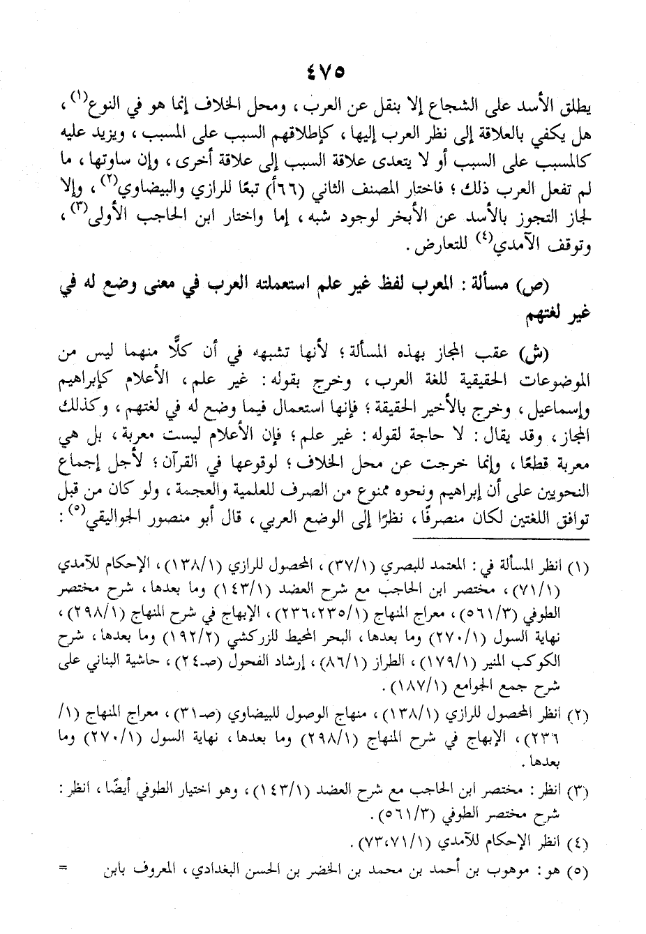 ص: مسألَةٌ: المُعْرَبُ لفظٌ غيرُ عَلَمٍ اسْتَعْمَلَتْه العَرَبُ في معنَى وَضْعٍ له في غيرِ لُغَتِهم.