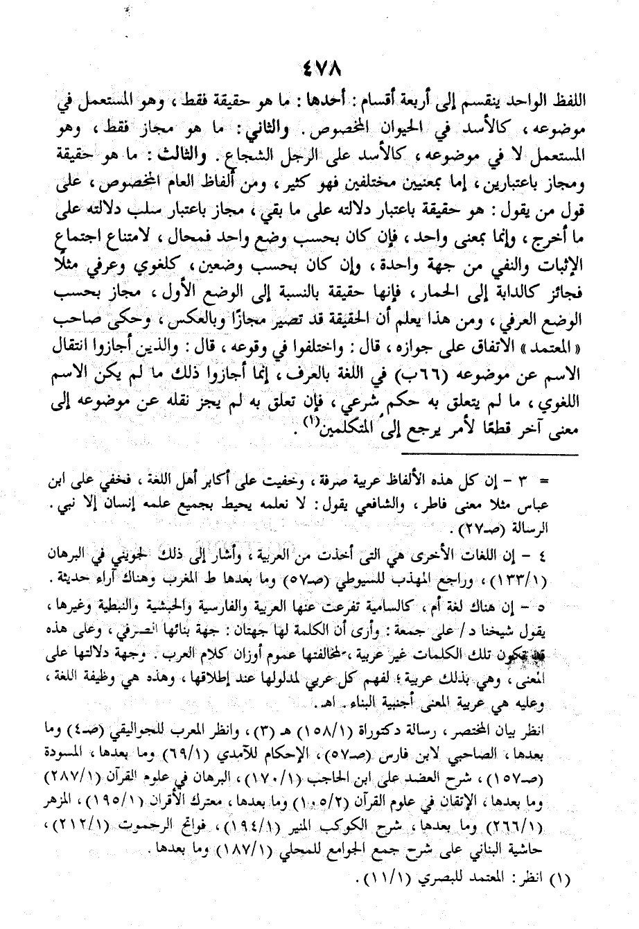 والثالثُ: ما هو حقيقةٌ ومجازٌ باعتبارَيْنِ، إمَّا بمعنيَيْنِ مُخْتَلِفَيْنِ فهو كثيرٌ، ومن ألفاظِ العامِّ المخصوصِ، على قولِ مَن يقولُ: هو حقيقةٌ باعتبارِ دَلالَتِه على ما بَقِيَ مجازٌ، باعتبارِ سَلْبُ دلالَتِه على ما أَخْرَجَ، وإنَّما بمعنًى واحدٍ، فإنْ كانَ بحسَبِ وَضْعٍ واحدٍ فمُحالٌ، لامتناعِ اجْتماعِ الإثباتِ والنفْيِ من جِهَةٍ واحدةٍ، وإنْ كانَ بحسَبِ وضعَيْنِ، كلُغَوِيٍّ وعُرْفِِيٍّ مثلاً، فجائزٌ كالدابَةِ إلى الحمارِ، فإنَّها حقيقةٌ بالنسبةِ إلى الوضْعِ الأوَّلِ، مجازٌ بحسَبِ الوضْعِ العُرْفِيِّ، ومن هذا يُعْلَمُ أنَّ الحقيقةَ قد تَصِيرُ مَجازاً بالعكسِ.