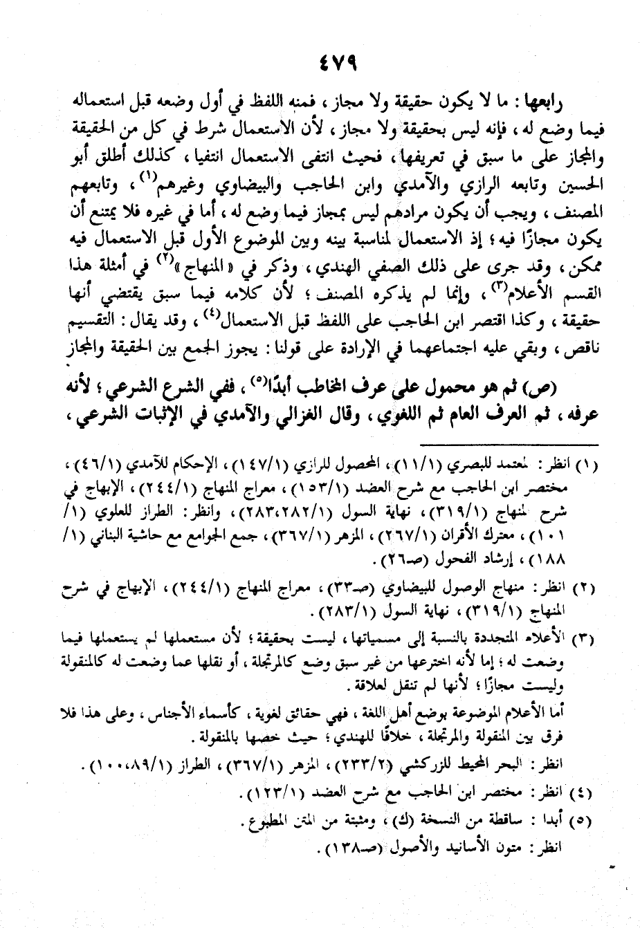 رابِعُها: ما لا يكونُ حقيقةً ولا مجازاً، فمنه اللفظُ في أوَّلِ وضْعِه قبلَ اسْتِعْمالِه فيما وُضِعَ له، فإنَّه ليسَ بحقيقةٍ ولا مجازٍ؛ لأنَّ الاسْتِعْمالَ شَرْطٌ في كلٍّ من الحقيقةِ، والمجازُ على ما سَبَقَ في تعريفِها، فحيثُ انْتَفَى الاستعمالُ انْتَفَيَا، كذلك أَطْلَقَ أَبُو الحُسَيْنِ وتَابَعَهُ الرَّازِيُّ والآمِدِيُّ وابنُ الحَاجِبِ والبَيْضَاوِيُّ وغيرُهم، وتَابَعَهم المُصَنِّفُ ويَجِبُ أنْ يكونَ مُرادُهم ليسَ بمَجازٍ فيما وُضِعَ له، أمَّا في غيرِه فلا يَمْتَنِعُ أنْ يكونَ مجازاً فيه، إذ الاستعمالُ لمُنَاسَبَةٍ بينه وبينَ الموضوعِ الأوَّلِ قبلَ الاستعمالِ فيه مُمْكِنٌ، وقد جَرَى على ذلك الصَّفِيُّ الهِنْدِيُّ، وذَكَرَ في (المِنْهاجِ) في أمْثَلَةِ هذا القِسمُ الأعْلامُ، وإنَّما لم يَذْكُرُه المُصنِّفُ؛ لأنَّ كلامَه فيما سَبَقَ يَقْتَضِي أنَّها حَقيقَةٌ، وكذا اقْتَصَرَ ابنُ الحَاجِبِ على اللفظِ قبلَ الاستعمالِ وقد يُقالُ: التقسيمُ ناقِصٌ، وبَقِيَ عليه اجْتماعُهُما في الإرَادَةِ على قَوْلِنا: يَجُوزُ الجَمْعُ بينَ الحقيقةِ والمجازِ.
