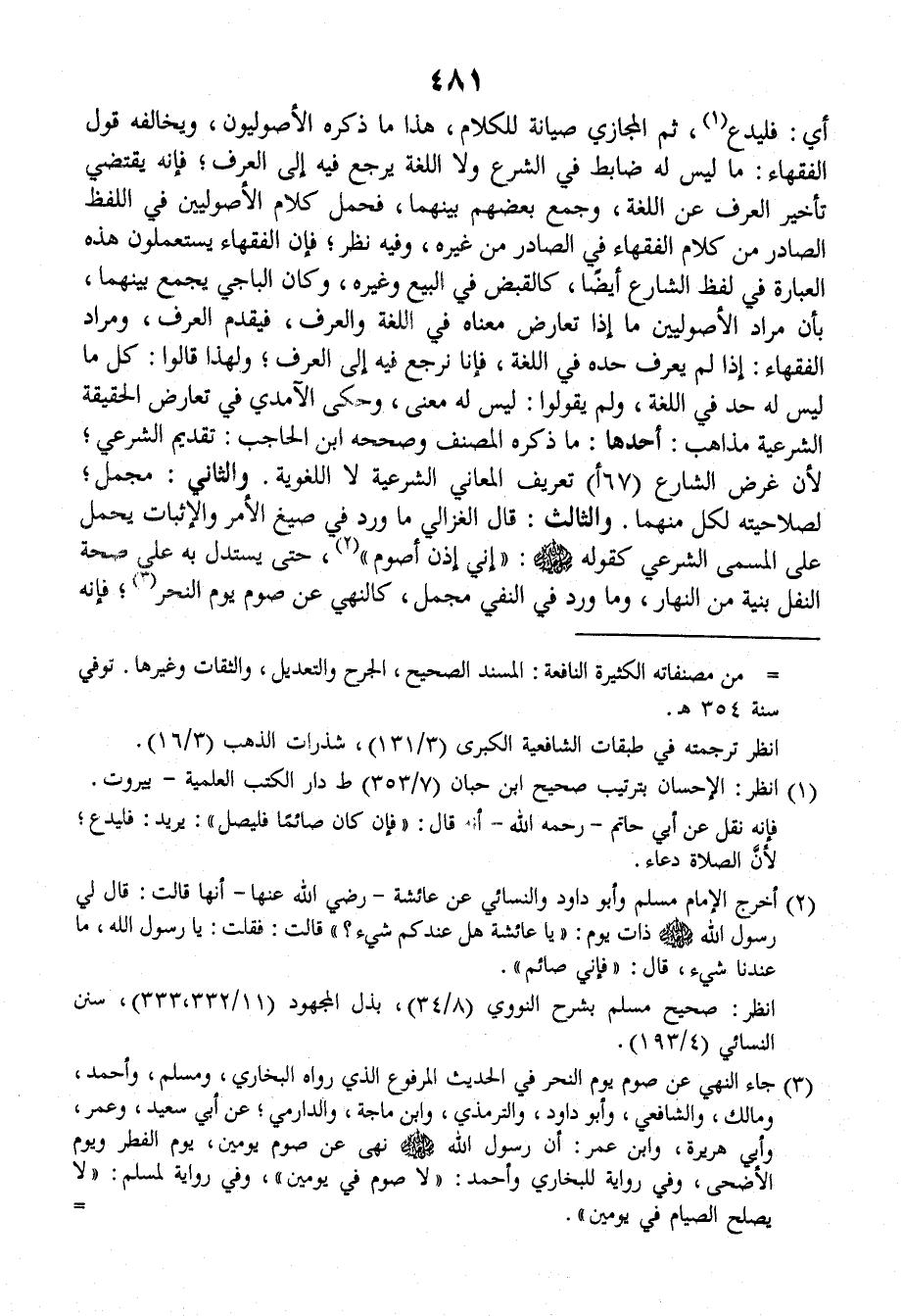 والثالثُ: قالَ الغزالِيُّ ما وَرَدَ في صِيَغِ الأمْرِ والإثباتِ يُحْمَلُ على المُسَمَّى الشرعيِّ كقولِه صَلَّى اللهُ عَلَيْهِ وَسَلَّمَ: ((إِنَّي إِذِنْ أَصُومُ)). حتى يُسْتَدَلَّ به على صِحَّةِ النفْلِ بنِيَّةٍ من النهارِ، وما وَرَدَ في النَّفْيِ مُجْمَلٌ، كالنَّهْيِ عن صَوْمِ يومِ النَّحْرِ، فإنَّه