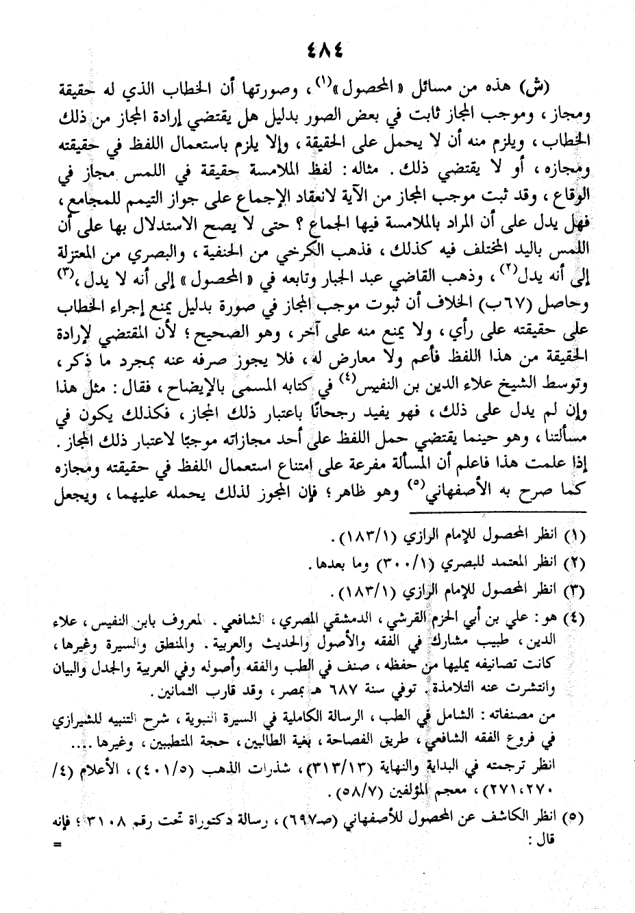 ش: هذه من مسائلِ (المحصولِ)، وصُورَتُها أنَّ الخطابَ الذي له حقيقةٌ ومجازٌ، ومُوجِبُ المجازُ ثابتٌ في بعضِ الصوَرِ بدليلٍ هل يَقْتَضِي إرادَةُ المجازِ من ذلك الخطابِ، ويَلْزَمُ منه أنْ لا يُحْمَلُ على الحقيقةِ، وإلاَّ يُلْزَمُ باسْتِعْمالِ اللفْظِ في حقيقَتِه ومَجازِه، أو لا يَقْتَضِي ذلك مثالُه: لفظُ المُلامَسَةُ حقيقةٌ في اللَّمْسِ مجازٌ في الوقاعِ، وقد ثَبَتَ مُوجِبُ المجازِ من الآيةِ لانْعقادِ الإجْماعِ على جَوازِ التَّيَمُّمِ للمُجامِعِ، فهل يَدُلُّ على أنَّ المُرادَ بالمُلامَسَةِ فيها الجماعُ؟ حتى لا يَصِحُّ الاستدلالُ بها على أنَّ اللَّمْسَ باليَدِ المُخْتَلِفُ فيه كذلك.