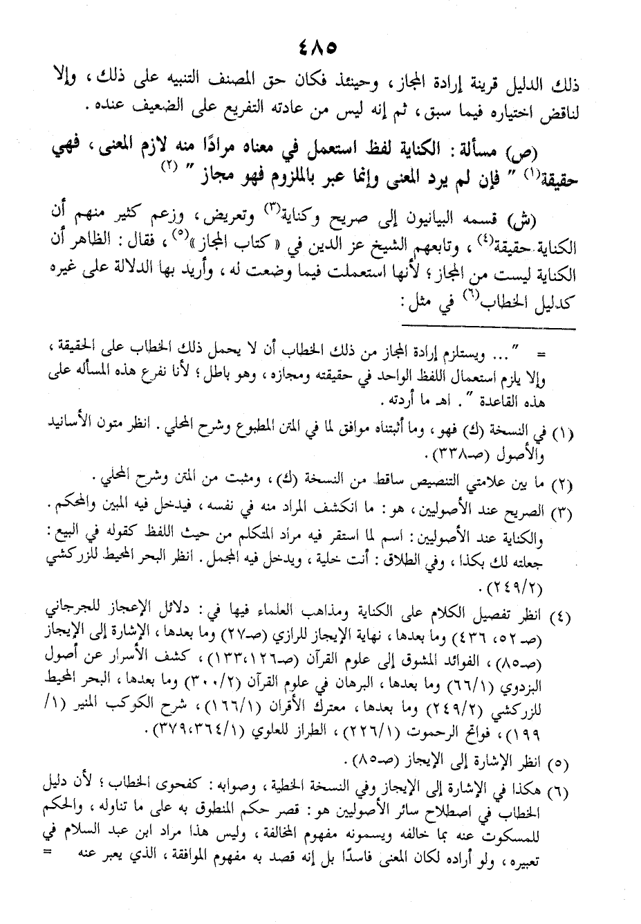 ش: قسَّمَه البيانِيُّونَ إلى صريحٍ وكنايةٍ وتعريضٍ، وزَعَمَ كثيرٌ منهم أنَّ الكنايةَ حقيقةٌ، وتَابَعَهُم الشيخُ عِزُّ الدِّينِ في (كتابِ المجازِ) فقالَ: الظاهرُ أنَّ الكنايةَ ليسَتْ من المجازِ؛ لأنَّها اسْتُعْمِلَتْ فيما وُضِعَتْ له، وأُرِيدَ بها الدلالَةُ على غيرِهِ كدليلِ الخطابِ في مثلِ: