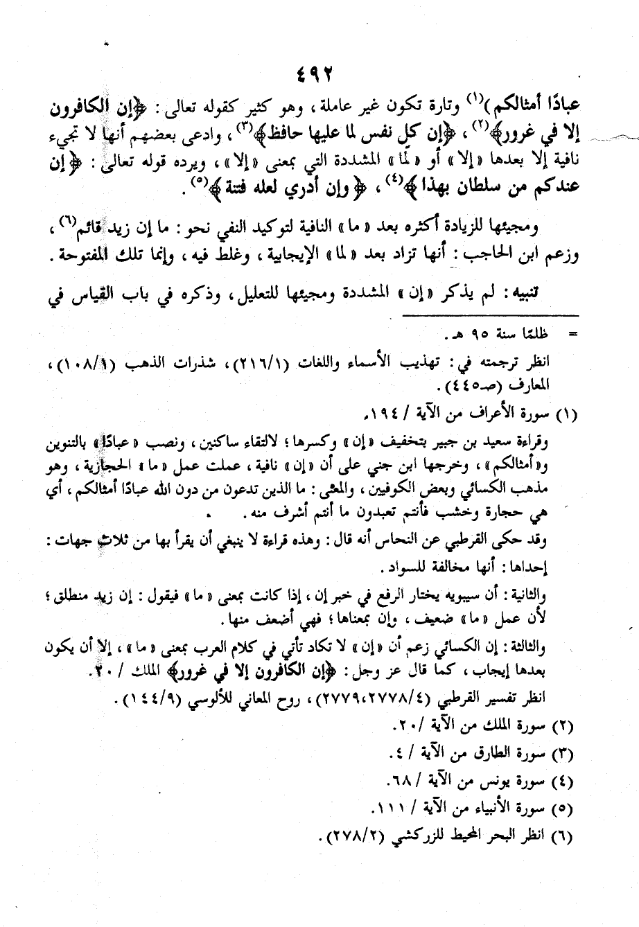 عِبَاداً أَمْثَالُكُمْ). وتارةً تكونُ غيرُ عاملَةٍ، وهو كثيرٌ كقولِه تعالى: {إِنِ الكَافِرُونَ إلاَّ فِي غُرُورٍ}، {إِنْ كُلُّ نَفْسٍ لَمَّا عَلَيْها حَافِظٌ} وادَّعَى بَعْضُهم أنَّها لا تَجِيءُ نافِيَةٌ إلاَّ بعدَها (إلاَّ) أو (لمَّا) المُشَدَّدَةُ التي بمعنَى (إلاَّ) ويَرُدُّه قولُه تعالى: {إِنْ عِنْدَكُمْ مِنْ سُلْطَانٍ بِهَذَا}، {وَإِنْ أَدْرِي لَعَلَّهُ فِتْنَةٌ}.