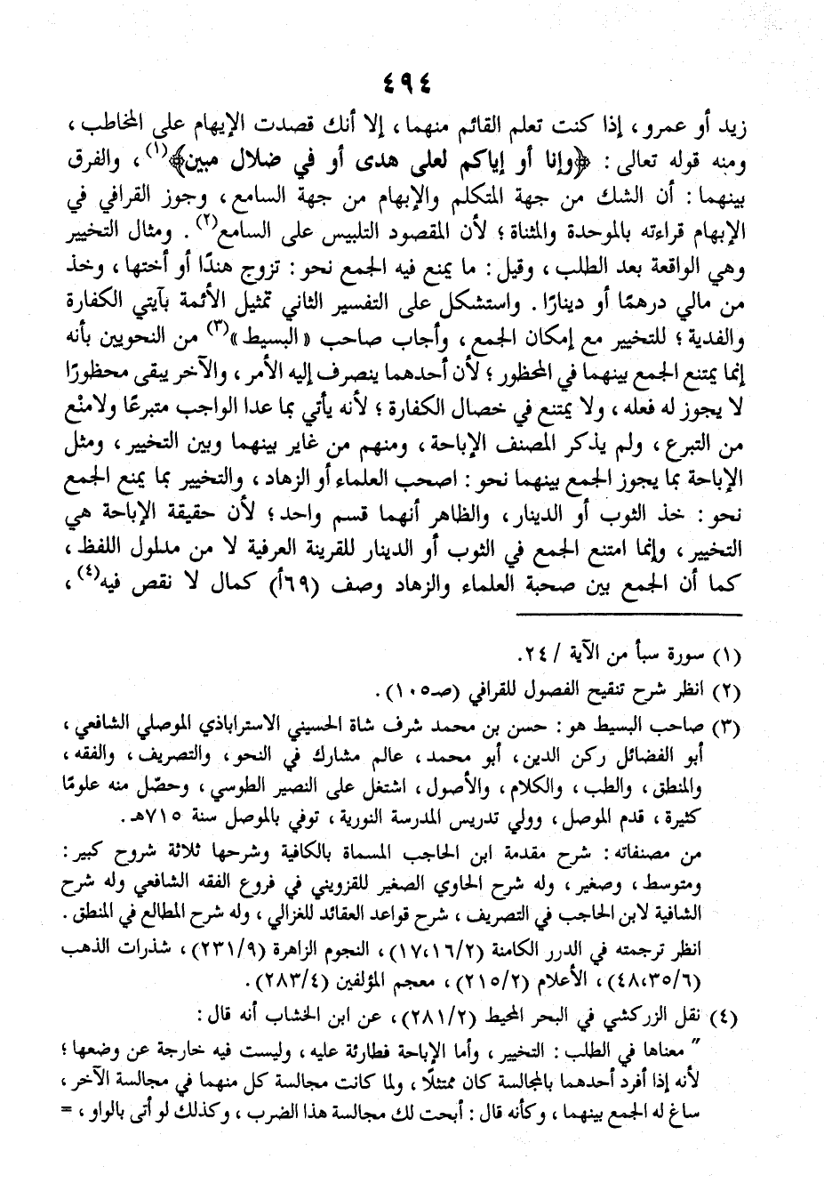 واسْتُشْكِلَ على التفسيرِ الثاني تَمْثِيلُ الأَئِمَّةِ بآيَتِي الكفَّارَةِ والفِدْيَةِ، للتَّخْييرِ معَ إمْكانِ الجَمْعِ، وأَجَابَ صاحبُ (البسيطِ) من النحْويينَ بأنَّه إنَّما يَمْتَنِعُ الجَمْعُ بينَهما في المحظورِ؛ لأنَّ أحدَهما يَنْصَرِفُ إليه الأمَرُ، والآخَرُ يَبْقَى محظوراً لا يَجُوزُ له فِعْلُه، ولا يَمْتَنِعُ في خِصالِ الكفَّارَةِ؛ لأنَّه يأتِي بمَا عدا الواجبُ مُتَبَرِّعاً ولا مَنَعَ من التبَرُّعِ، ولم يَذْكُرْ المُصَنِّفُ الإبَاحَةَ، ومنهم مَن غَايَرَ بينَهما وبينَ التخييرِ، ومثلُ الإبَاحَةِ بما يَجُوزُ الجَمْعُ بينَهما نحوَ: أَصْحَبَ العلماءُ أو الزهادُ، والتخييرُ بما يُمْنَعُ الجمعُ نحو: خُذْ الثوْبَ أو الدينارَ، والظاهرُ أنَّهما قِسْمٌ واحدٌ؛ لأنَّ حقيقةَ الإباحةِ هي التخييرُ، وإنَّما امتنع الجمع في الثوب أو الدينار للقرينة العرفية لا من مدلول اللفظ، كما أن الجمع بينَ صحبة العلماء والزهاد وصف (٦٩ أ) كمال لا نقص فيه،