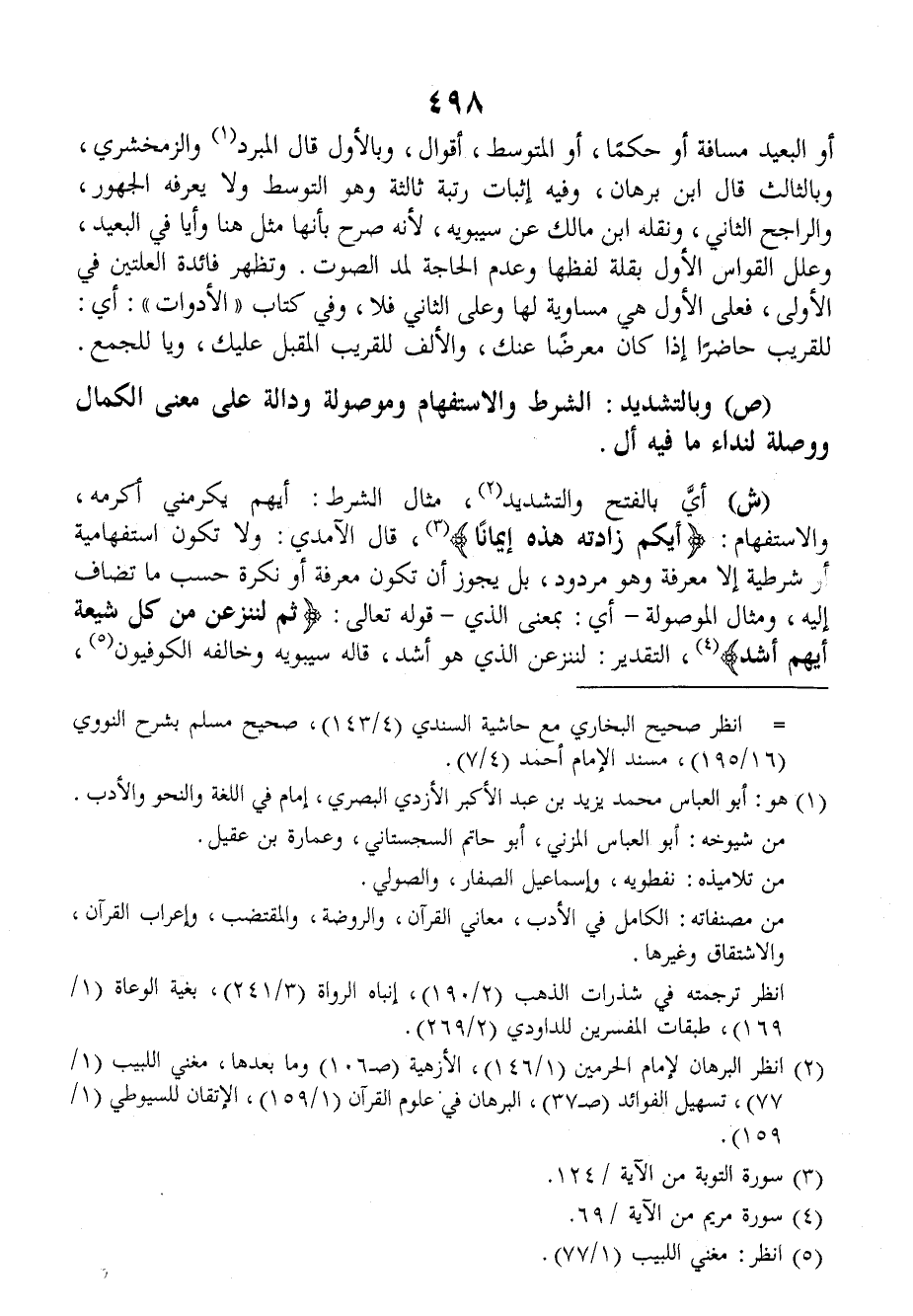 وبالأوَّلِ قالَ المُبَرِّدُ والزَّمَخْشَرِيُّ، وبالثالثِ قالَ ابنُ بُرْهانٍ، وفيه إثباتُ رُتْبَةٍ ثالثةٍ وهو التَّوَسُّطُ ولا يَعْرِفُه الجمهورُ، والراجحُ الثاني، ونَقَلَه ابنُ مالِكٍ عن سِيبَوَيْه؛ لأنَّه صَرَّحَ بأنَّها مثلُ (هنا) و (أيا) في البعيدِ، وعَلْلَّ القَوَّاسُ الأوَّلَ بقلَّةِ لفظِها وعَدَمِ الحاجةِ لمَدِّ الصوتِ، وتَظْهَرُ فائدَةُ العِلَّتَيْنِ في الأُولَى، فعَلَى الأوَّلِ هي مُساوِيَةٌ لها وعلى الثاني فلا، وفي كتابِ (الأدَواتِ)؛ أي: للقريبِ حاضراً إذا كانَ مُعْرِضاً عنك، والألِفُ للقريبِ المُقْبِلِ عليك، و (يا) للجَمْعِ.