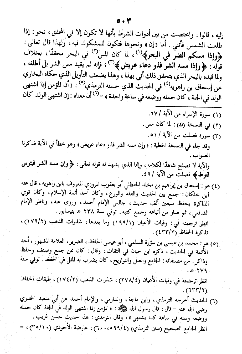 أمَّا (إنَّ) ونحوها فتكونُ للمَشْكُوكِ فيه، ولهذا قالَ تعالى: {وَإِذَا مَسَّكُمُ الضُّرُّ فِي الْبَحْرِ} لمَّا كانَ المَسُّ في البحرِ مُحَقَّقاً، بخلافِ قولِه: {وَإِذَا مَسَّهُ الشَّرُّ فَذُو دُعَاءٍ عَرِيضٍ} فإنَّه لم يُقَيِّدْ مَسُّ الشَّرِّ بل أَطْلَقَه، ولمَّا قَيَّدَه بالبحرِ الذي يَتَحَقَّقُ ذلك أَتَى بهذا، وهذا يُضْعِفُ التاويلَ الذي حَكَاهُ البُخَارِيُّ عن إِسْحَاقَ بنِ رَاهُويَهْ في الحديثِ الذي حَسَّنَه التِّرْمِذِيِّ: ((أَنَّ الْمُؤْمِنَ إِذَا اشْتَهَى الْوَلَدَ فِي الْجَنَّةِ، كَانَ حَمْلُهُ وَوَضْعُهُ فِي سَاعَةٍ وَاحِدَةٍ)) أنَّ معناهُ: إنِ اشْتَهَى الولَدَ كانَ