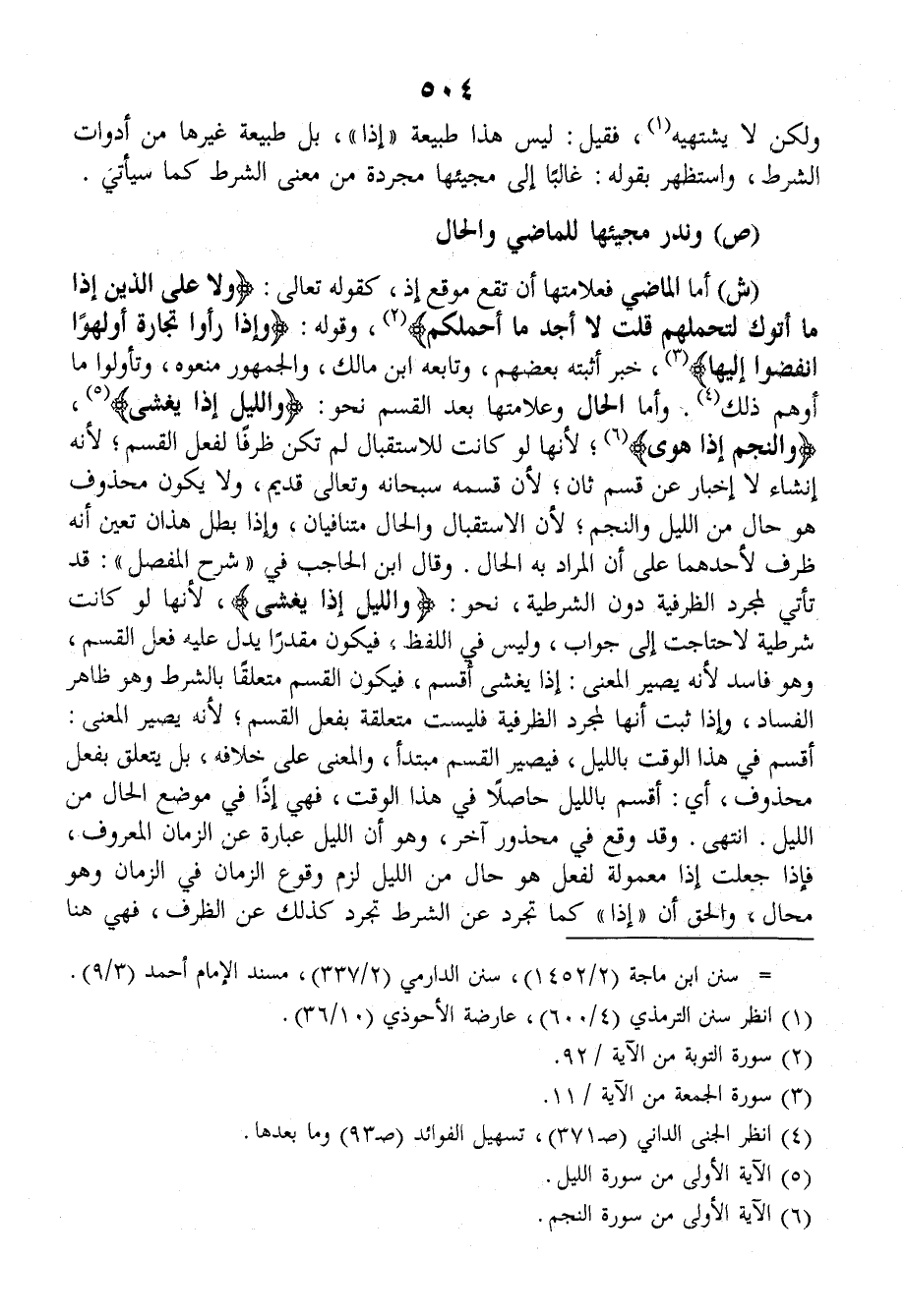 وقالَ ابنُ الحَاجِبِ في (شَرْحِ المُفَصَّلِ): قد تَاتِي لمُجَرَّدِ الظرفيَّةِ دونَ الشرطيَّةِ، نحوَ: {وَالْلَيْلِ إِذَا يَغْشَى}؛ لأنَّها لو كانَتْ شَرطيَّةٌ لاحْتَاجَتْ إلى جوابٍ، وليسَ في اللفظِ، فيكونُ مُقَدَّراً يَدُلُّ عليه فِعْلُ القَسَمِ، وهو فَاسِدٌ؛ لأنَّه يَصِيرُ المعنَى: إذا يَغْشَى أَقْسَمَ، فيكونُ القسمُ مُتَعَلِّقاً بالشرطِ وهو ظاهرُ الفسادِ، وإذا ثَبَتَ أنَّها لمُجَرَّدِ الظرفيَّةِ فليسَتْ مُتَعَلِّقَةٌ بفِعْلِ القَسَمِ؛ لأنَّه يَصِيرُ المَعْنَى: أَقْسَمَ في هذا الوَقْتِ بالليلِ، فيَصِيرُ القسمُ مبتدأً، والمعنَى على خلافِه، بل يَتَعَلَّقُ بفِعْلٍ محذوفٍ؛ أي: أَقْسَمَ بالليلِ حاصلاً في هذا الوقْتِ، فهي إذاً في مَوْضِعِ الحالِ من الليلِ. انتهى. وقد وقع في محذورٍ آخَرَ، وهو أنَّ الليلَ عبارَةٌ عن الزمانِ المعروفِ، فإذا جَعَلْتَ إذا مَعْمُولَةٌ لفِعْلٍ هو حالٌ من الليلِ لَزِمَ وقوعُ الزمانِ في الزمانِ وهو مُحالٌ، والحقُّ أنَّ (إِذَا) كما تَجَرَّدَ عن الشرْطِ تَجَرَّدَ كذلك عن الظرْفِ، فهي هنا