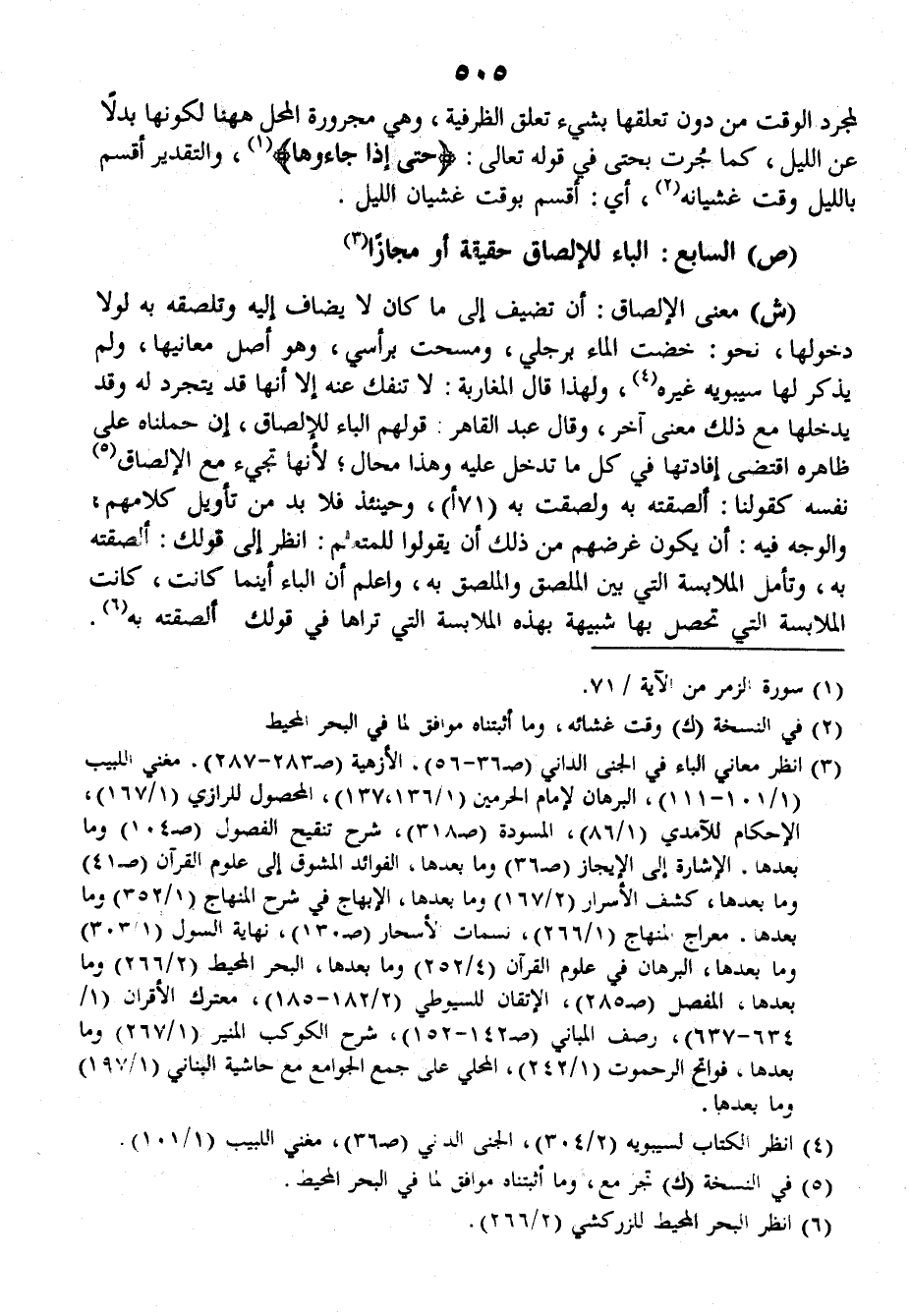 وقالَ عبدُ القاهرِ: قولُهم الباءُ للإلصاقِ إنْ حَمْلْنَاهُ على ظاهرِه اقْتَضَى إفادتُها في كلِّ ما تَدْخُلُ عليه وهذا محالٌ؛ لأنَّها تَجِيءُ معَ الإلصاقِ نَفْسُه كقولِنَا: أَلْصَقَتْهُ به ولُصِقَتْ به، وحينَئذٍ فلا بُدَّ من تَاويلِ كلامِهم، والوجْهُ فيه أنْ يكونَ غَرَضَهُمْ من ذلك أنْ يقولُوا للمُتَعَلِّمِ: انْظُرْ إلى قولِك: أَلْصَقَتْهُ به، وتَأَمَّلِ المُلابَسَةَ التي بينَ المُلْصِقِ والمُلْصَقِ به، واعْلَمْ أنَّ الباءَ أينَما كانَت، كانَت المُلابَسَةُ التي تَحْصُلُ بها شَبِيهَةً بهذِه المُلابَسَةِ التي تَرَاهَا في قولِك: أَلْصَقَتْه به.
