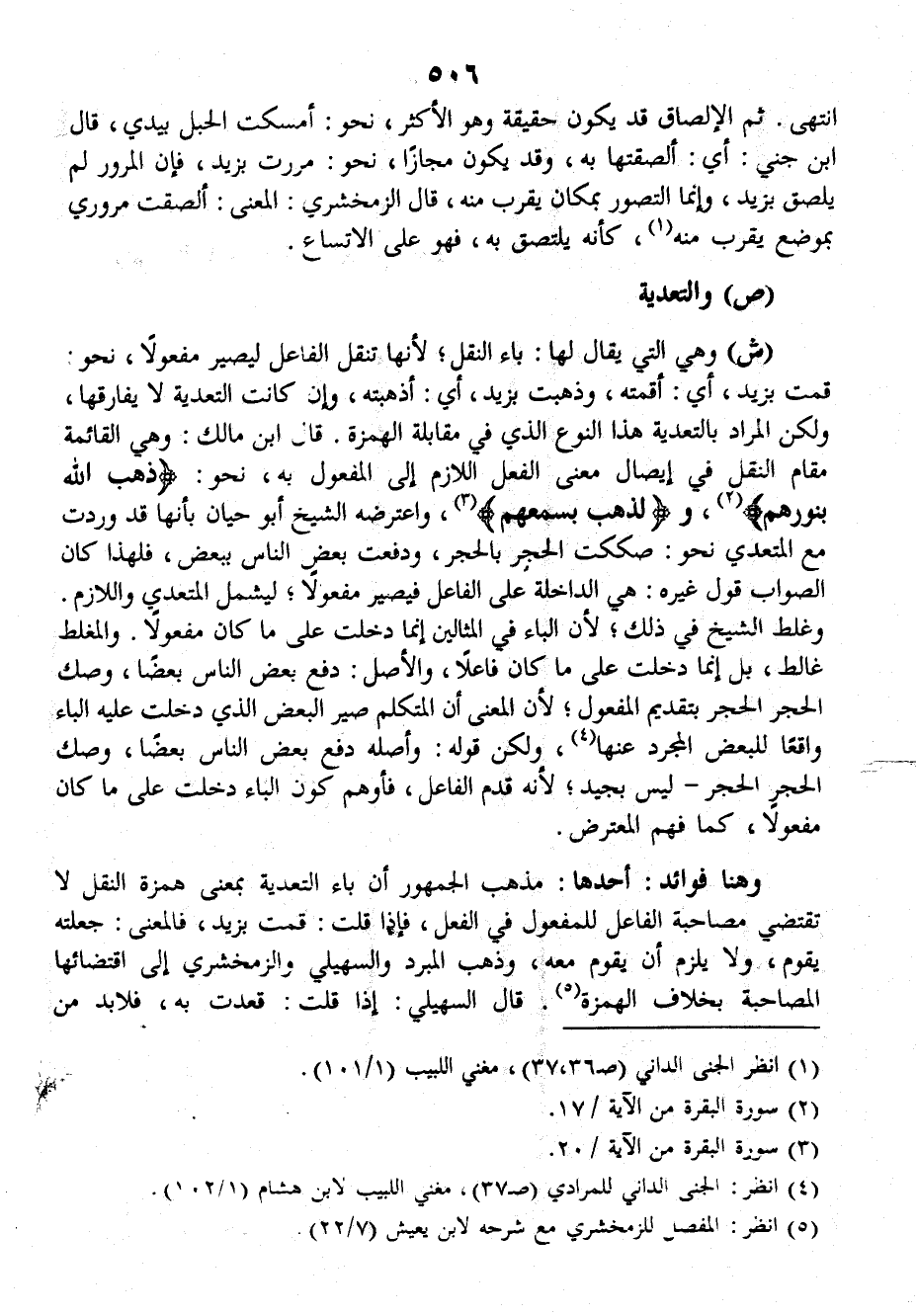 قالَ ابنُ مالكٍ: وهي القائِمَةُ مُقامَ النَّقْلِ في إيصالِ معنَى الفِعْلِ اللازمِ إلى المَفْعُولِ به، نحوَ: {ذَهَبَ اللهُ بِنُورِهِمْ} و {لَذَهَبَ بِسَمْعِهِمْ} واعْتَرَضَهُ الشيخُ أَبُو حَيَّانٍ بأنَّها قد وَرَدَتْ معَ المُتَعَدِّي نحوَ: صَكَكْتُ الحَجَرَ بالحَجَرِ، ودَفَعْتُ بعضَ الناسِ ببَعْضٍ، فلهذا كانَ الصوابُ قولَ غيرِه، هي الداخلةُ على الفاعلِ فيَصِيرُ مفعولاً، ليَشْمَلَ المتعدِيَ واللازمَ.