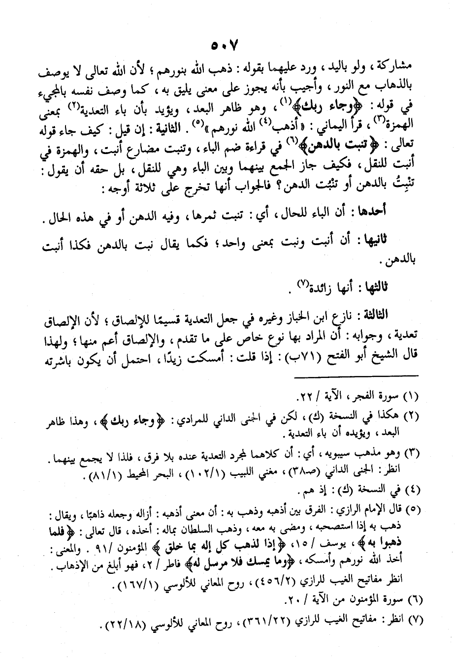 قَرَأَ اليَمَانِيُّ: (أَذْهَبَ اللهُ نُورَهُمْ) الثانيةُ: إنْ قيلَ: كيفَ جَاءَ قولُه تعالَى {تُنْبِتُ بِالدُّهْنِ} في قراءةٍ: ضَمُّ الباءِ، وتُنْبِتُ: مضارعُ أنْبَتَ، والهمزةُ في أَنْبَتَ للنقلِ، فكيفَ جَازَ الجَمْعُ بينَهما وبينَ الباءِ وهي للنقلِ، بل حَقُّهُ أنْ يَقُولَ: تُنْبِتُ بالدُّهْنِ أو تُنْبِتُ الدُّهْنَ؟ فالجوابُ أنَّها تَخْرُجُ على ثلاثةِ أوجِهٍ: