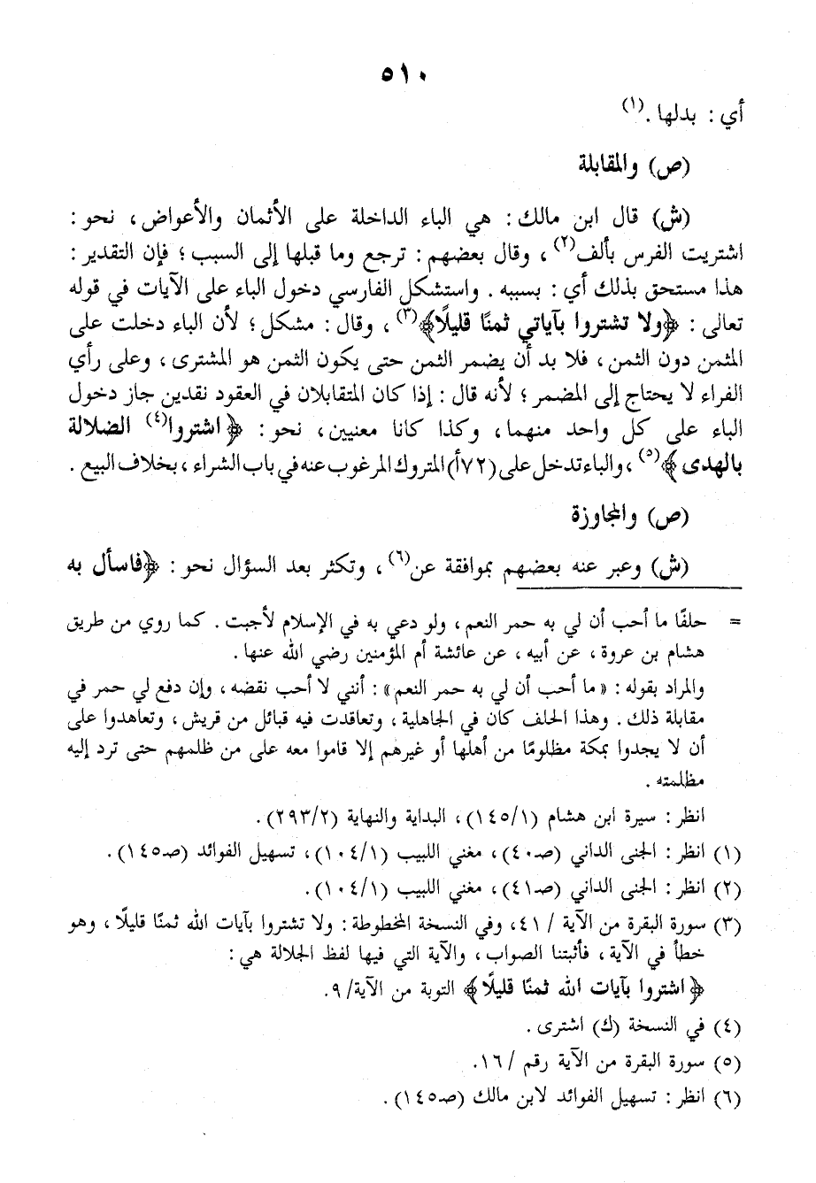ش: قالَ ابنُ مالِكٍ: هي الباءُ الداخلةُ على الأثمانِ والأعراضِ، نحوَ: اشْتَرَيْتُ الفَرَسَ بأَلْفٍ، وقالَ بعضُهم: تَرْجِعُ وما قَبْلَها إلى السببِ، فإنَّ التقديرَ: هذا مُسْتَحَقٌّ بذلك أي: بسبَبِه، واسْتَشْكَلَ الفارِسِيُّ دخولَ الباءِ على الآياتِ في قَوْلِهِ تعالَى: {وَلاَ تَشْتَرُوا بِآيَاتِي ثَمَناً قَلِيلاً}. وقالَ: مُشْكَلٌ؛ لأنَّ الباءَ دَخَلَتْ على المُثْمَنِ دُونَ الثَّمَنِ، فلا بُدَّ أنْ يُضْمَرَ الثمَنُ حتى يكونَ الثمنُ هو المُشْتَرَى، وعلى رَاي الفَرَّاءِ لا يَحْتَاجُ إلى المُضْمَرِ؛ لأنَّه قالَ: إذا كانَ المُتَقابِلاتُ في العُقودِ نَقْدَيْنِ جَازَ دخولَ الباءِ على كلِّ واحدٍ منهما، وكذا كانَا معنَيَيْنِ، نحوَ: {اشْتَرَوُا الضَّلالَةَ بِالْهُدَى} والباءُ تَدْخُلُ على المَتْروكِ المرغوبِ عنه في بابِ الشراءِ بخلافِ البَيْعِ.