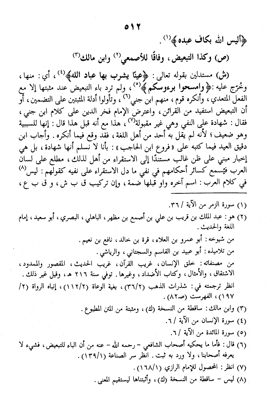 ش: مُسْتَدِلِينَ بقولِه تعالَى: {عَيْناً يَشْرَبُ بِهَا عِبَادُ اللهِ}؛ أي: منْها، وخَرَجَ عليه: {وَامْسَحُوا بِرُؤُوسِكُمْ} ولم تَرِدْ باءُ التَّبْعِيضِ عندَ مُثْبِتِها إلاَّ معَ الفعلِ المُتَعَدِّي، وأَنْكَرَهُ قومٌ، منهم ابنُ جِنِّي وتَأَوَّلُوا أَدِلَّةَ المُثْبَتِينَ على التَّضْمِينِ، أو أنَّ التَّبْعِيضِ اسُتِفيدَ من القرائنِ، واعْتَرَضَ الإمامُ فَخْرُ الدِّينِ على كلامِ ابنِ جِنِّي، فقالَ: شهادةٌ على النَّفْي وهي غيرُ مَقْبُولَةٍ، هذا معَ أنَّه قبلَ هذا قالَ: إنَّها للسببِيَّةِ وهو ضعيفٌ؛ لأنَّه لم يَقُلْ به أَحَدٌ من أهْلِ اللُّغَةِ، فقد وَقَعَ فيما أَنْكَرَهُ، وأَجَابَ ابنُ دَقِيقِ العِيدِ فيما كَتَبَهُ على (فُروعِ ابنِ الحَاجِبِ): بأنَّا لا نُسَلِّمُ أنَّها شهادةٌ، بل هي إخْبَارٌ مَبْنِيٌّ على ظَنٍّ غالبٍ مُسْتَنَداً إلى الاستقراءِ مَن أُهِّلَ لذلك، مُطَلِّعٌ على لسانِ العَرَبِ فيَسْمَعُ كسائِرِ أَحْكَامِهِم في نَفْي ما دَلَّ الاستقراءُ على نَفْيهِ كقولِهم: ليسَ في كلامِ العَرَبِ: اسمٌ آخِرَهُ واوٌ قَبْلَها ضَمَّةٌ، وإنَّ تركيبَ (ق ب ش)، و (ق ب ع)،