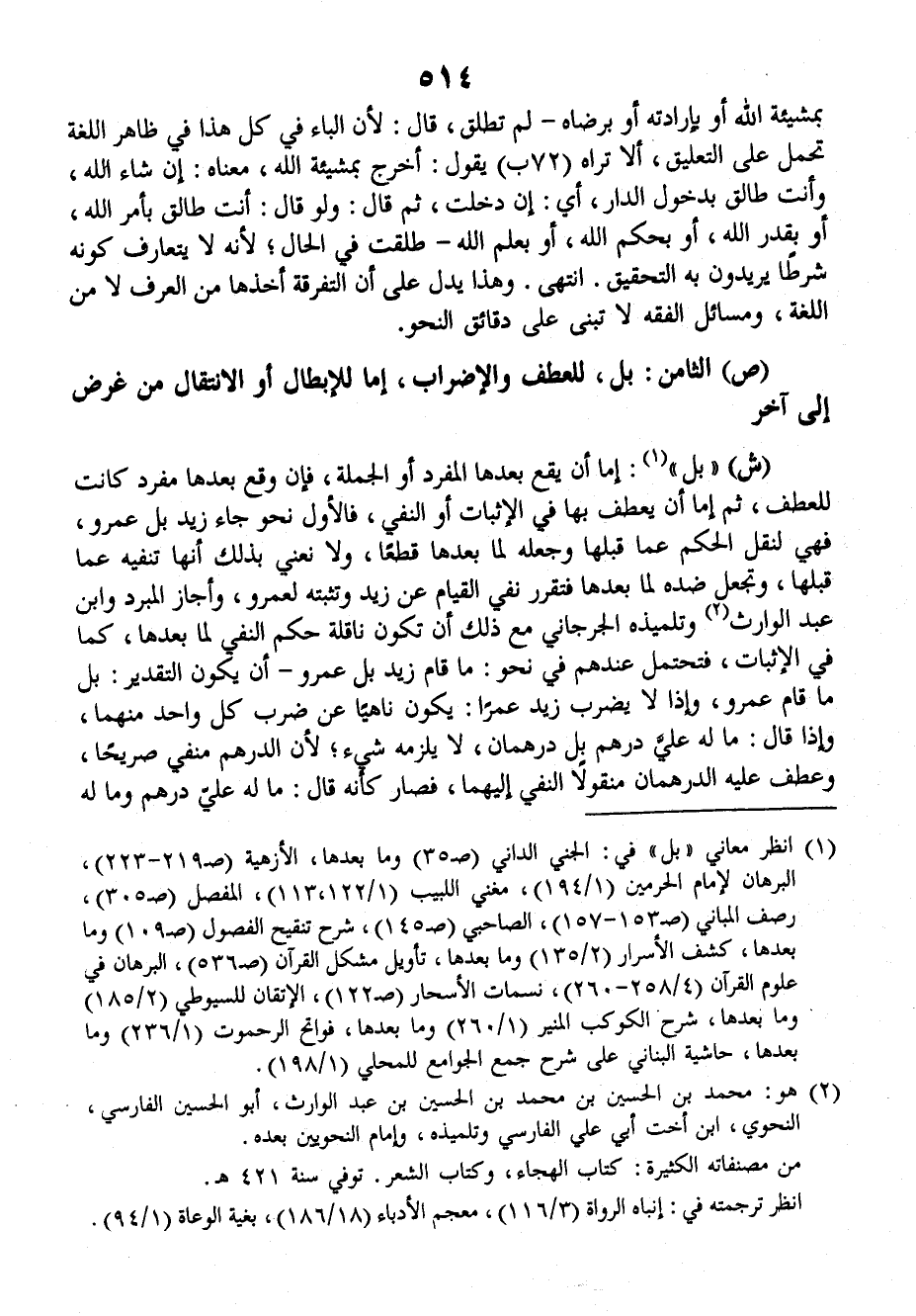 ش: (بل) إمَّا أنْ يَقَعَ بَعْدَها المُفْرَدُ أو الجُمْلَةُ، فإنْ وَقَعَ بَعْدَها مُفْرَدٌ كانَتْ للعَطْفِ ثمَّ إمَّا أنْ يُعْطَفَ بها في الإثباتِ أو النفْيِ، فالأوَّلُ نحوُ: جَاءَ زَيدٌ بل عَمْرٌو، فهي لنَقَلِ الحُكْمِ عمَّا قَبْلَهَا وجَعْلِهُ لَمَّا بَعْدَهَا قَطْعاً، ولا نَعْنِي بذلك أنَّها تَنْفِيَه عمَّا قَبْلَها، وتُجْعَلُ ضِدَّهُ لِمَا بَعْدَها فتُقَرِّرُ نَفْيَ القيامِ عن زيدٍ وتُثْبِتُه لعَمْرٍو، وأَجَازَ المُبَرِّدُ وابنُ عَبْدِ الوارثِ، وتلميذُه الجُرْجَانِيُّ معَ ذلك أنْ تكونَ نَاقِلَةً حُكْمَ النَّفْيِ لِمَا بعدَها، كما في الإثباتِ فتَحْتَمِلُ عندَهم في نحوِ: ما قَامَ زيدٌ بل عمرٌو، أنْ يكونَ التقديرُ: بل ما قَامَ عمرٌو، وإذا لا يَضْرِبْ زيدٌ عمراً، يكونُ ناهياً عن ضربِ كلِّ واحدٍ منهما، وإذا قالَ: ما له عليَّ دِرْهَمٌ بل دِرْهَمَانِ، لا يَلْزَمَه شيءٌ؛ لأنَّ الدرهمَ مَنْفِيٌّ صريحاً، وعُطِفَ عليه الدرْهَمَانِ مَنْقُولاً النفْيُ إليهما، فصَارَ كأنَّه قالَ: ما له عَلَيَّ دِرْهَمٌ وما له