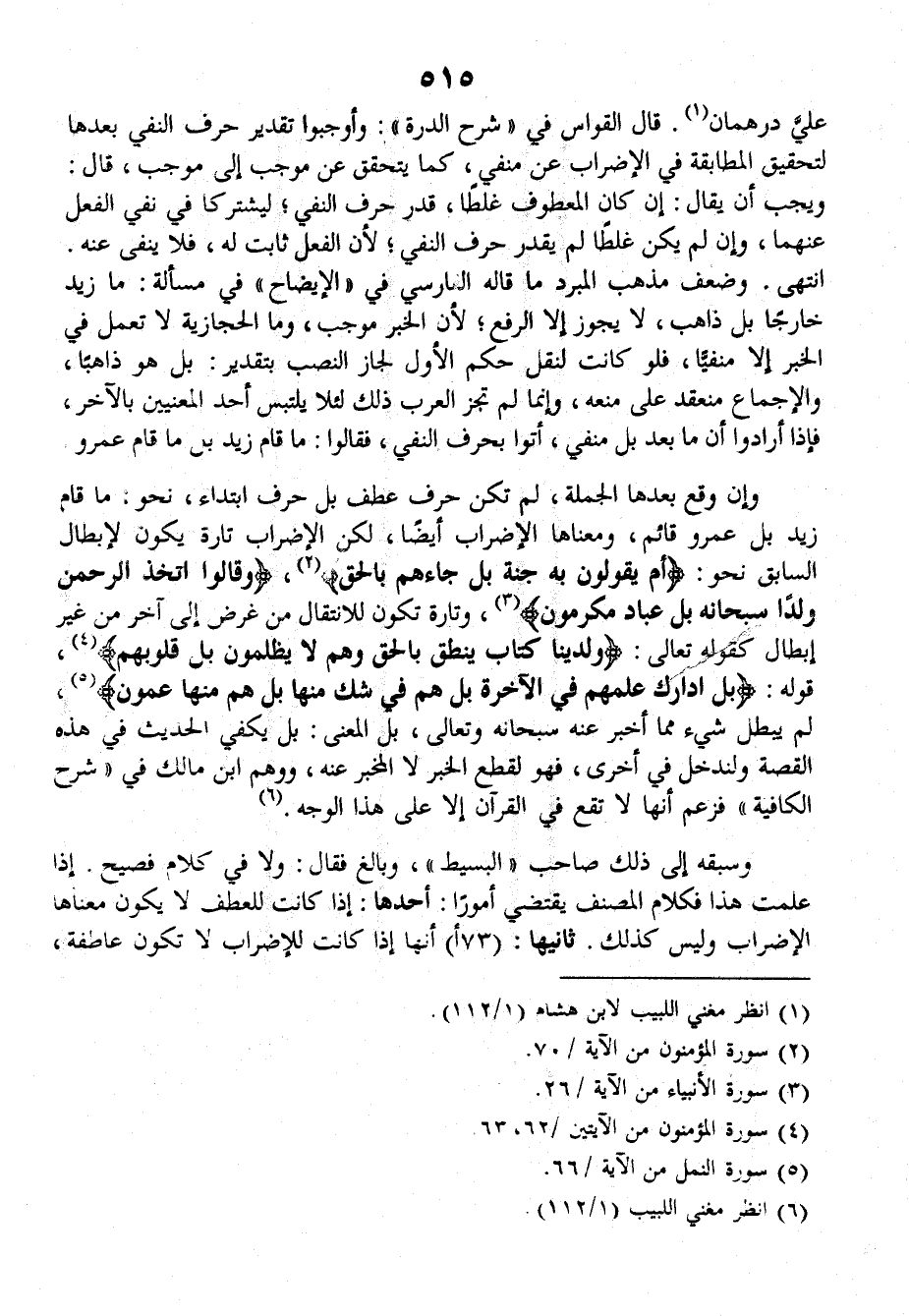 قالَ القَوَّاسُ في (شرحِ الدرَّةِ) وأَوْجَبُوا تقديرَ حَرْفِ النَّفْيِ بعدَها لتحقيقِ المُطَابَقَةِ في الإضرابِ عن مَنْفِيٍّ، كما يَتَحَقَّقُ عن مُوجَبِ إلى مُوجَبٍ، قالَ: ويَجِبُ أنْ يُقالَ: إنْ كانَ المعطوفُ غَلَطاً، قَدَّرَ حَرْفَ النفْيِ، ليَشْتَرِكَا في نَفْيِ الفِعْلِ عنْهُما، وإنْ لم يَكُنْ غَلَطاً لم يُقَدَّرْ حَرْفَ النَّفْي؛ لأنَّ الفِعْلَ ثَابِتٌ له، فلا يُنْفَى عنه انْتَهَى.