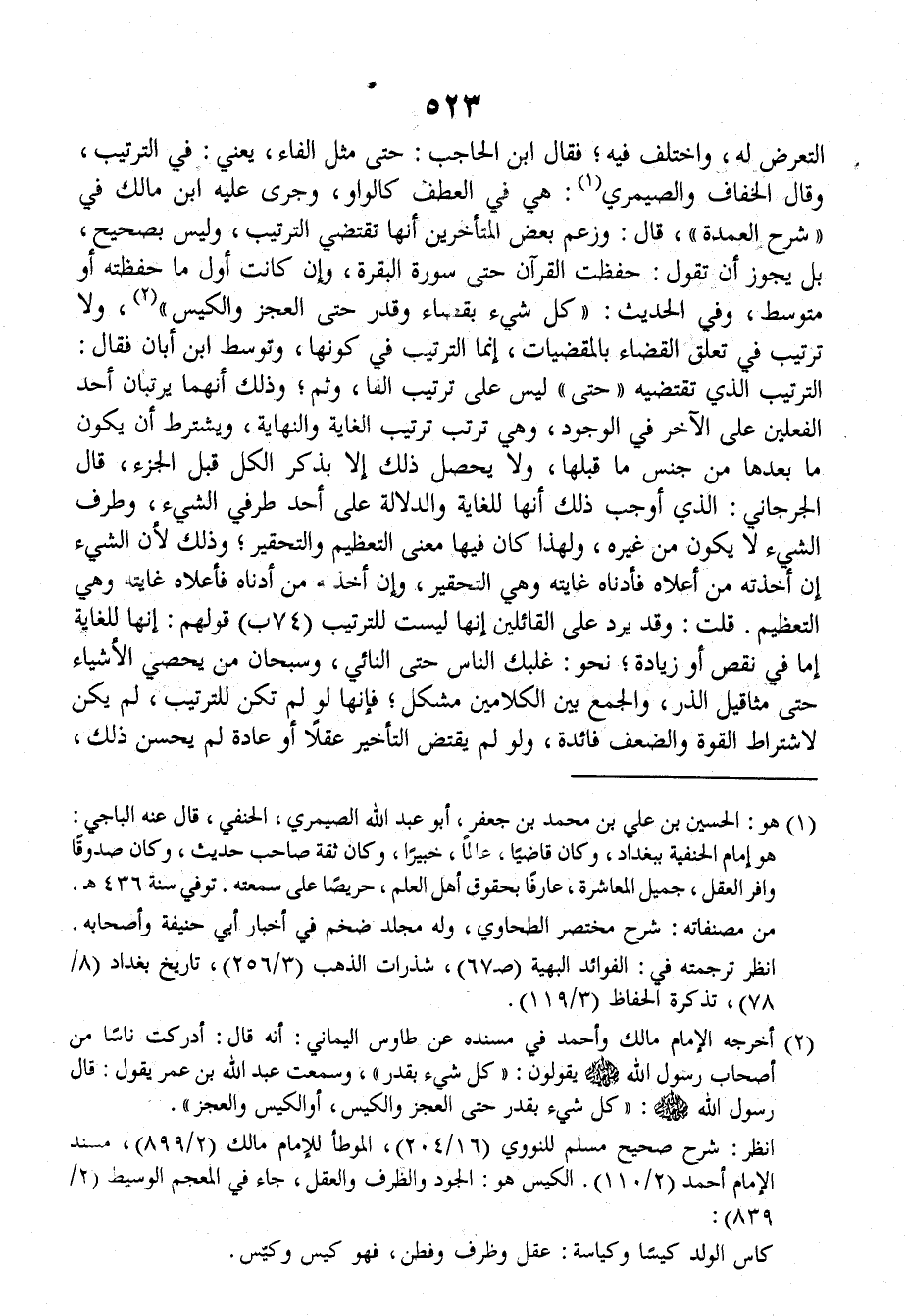 التَّعَرَّضَ له، واخُتُلِفَ فيه، فقالَ ابنُ الحَاجِبِ، حتى مِثْلُ الفاءِ، يعني: في الترتيبِ، وقالَ الخفافُ= والصَّيْمَرِيُّ=: هي في العطفِ كالواوِ، وجَرَى عليه ابنُ مالِكٍ في (شَرْحِ العُمْدَةِ) قالَ: وزَعَمَ بعضُ المُتَأَخِّرِينَ أنَّها تَقْتَضِي الترْتِيبَ. وليسَ بصحيحٍ، بل يَجُوزُ أنْ تقولَ: حَفِظْتُ القرآنَ حتى سورةَ البَقَرَةِ، وإنْ كانَتْ أوَّلَ ما حَفِظْتَه أو مُتَوَسِّطَ، وفي الحديثِ: ((كُلُّ شَيْءٍ بِقَضَاءٍ وَقَدَرٍ حَتَّى الْعَجَزُ والكَيْسُ)). ولا ترتيبَ في تَعَلُّقِ القضاءِ بالمُقْضَياتِ، إنَّما الترتيبُ في كونِها، وتوسَّطَ ابنُ أَبَانٍ فقالَ: الترتيبُ الذي تَقْتَضِيهِ (حتى) ليسَ على تَرْتِيبِ الفاءِ، وثمَّ، وذلِك أنَّهما يُرَتِّبانِ أَحَدَ الفِعْلَيْنِ على الآخَرِ في الوجودِ، وهي تُرَتَّبُ ترتيبَ الغايةِ والنهايَةِ، ويُشْتَرَطُ أنْ يكونَ ما بَعْدَها من جِنْسِ ما قَبْلَها، ولا يَحْصُلُ ذلك إلاَّ بذِكْرِ الكُلِّ قبلَ الجُزْءِ.