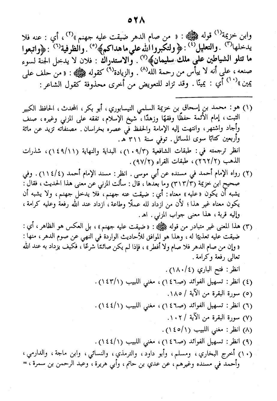 وابن خُزَيْمَةَ قولُه صَلَّى اللهُ عَلَيْهِ وَسَلَّمَ: ((مَنْ صَامَ الدَّهْرَ ضُيِّقَتْ عَلَيْهِ جَهَنَّمُ))؛ أي: عنه فلا يَدْخُلُها، والتعليلُ: {وَلُتَكَبِّرُوا اللهَ عَلَى مَا هَدَاكُمْ}. والظرفيَّةُ: {وَاتَّبَعُوا مَا تَتْلُو الشَّيَاطِينَ عَلَى مُلْكِ سُلَيْمَانِ} والاسْتِدَراكِ، فلانٌ لا يَدْخُلُ الجنَّةَ لسُوءِ صُنْعِه، على أنَّه لا يَيْأَسُ من رحْمَةِ اللهِ، والزيادةُ كقولِه صَلَّى اللهُ عَلَيْهِ وَسَلَّمَ: ((مَنْ حَلِفَ عَلَى يَمِينٍ))؛ أي: يَمِيناً، وقد تُزَادُ للتَّعْويضِ من أُخْرَى محذوفَةٌ كقولِ الشاعرِ: